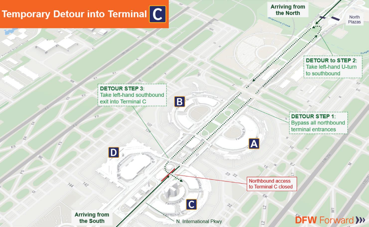 allas Fort Worth International Airport (DFW) has implemented various roadway closures and detours to support construction of the new bridge that will provide right-hand access into Terminal C, which is scheduled to be completed ahead of this summer. Additionally, a southbound detour into Terminal A has been implemented through the end of January to complete all remaining construction activity of the new access, following its temporary opening during the holiday travel period. These next phases of the International Parkway Project were strategically scheduled to begin after the busy holiday travel period. Signage will be in place to guide traffic along all detours and through construction areas.