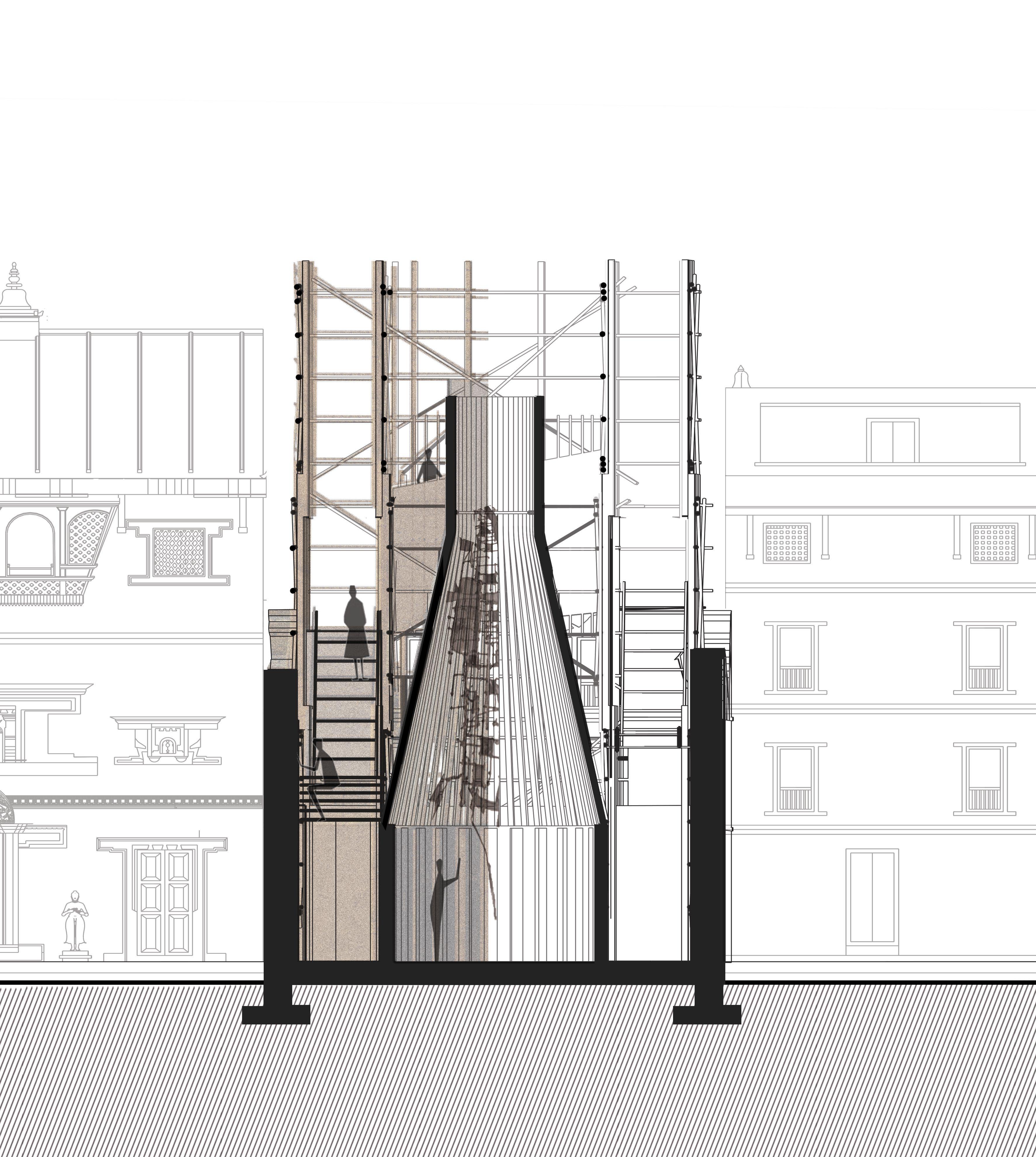 In the temporary pause between destruction and reconstruction, this intervention cradles Kathmandu’s tears, forgotten tales of resilience and loss during the chaos. With locals as the builders and ruins as building blocks, a layer of healing and renewal unfolds. Each passing moment is a testament to the city’s strength, where sorrow births resilience, and shattered fragments pave the path to a brighter future.