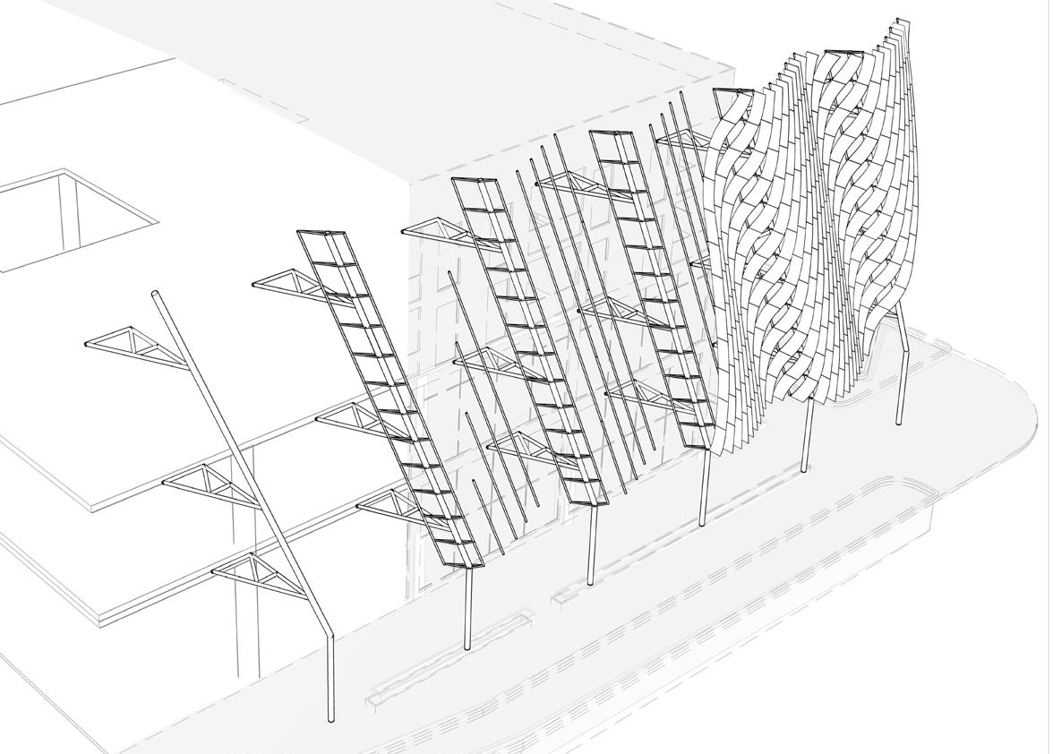 ROLES AND RESPONSIBILITIES_ This project was a collaborative effort between two members, where I took on the role of managing meetings and ensuring productive discussions. I focused on planning the floor plans, optimizing efficiency for both private and public access areas. Meanwhile, my partner developed a Rhino model to explore the building’s form, which I translated into technical drawings using Revit. I was also responsible for creating graphics for the presentation, while my partner handled the renders. Together, we collaborated on designing the structure of the facade to ensure both aesthetic appeal and structural integrity.
