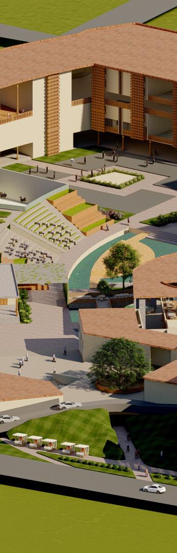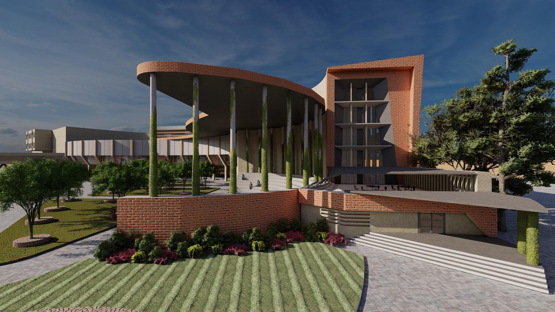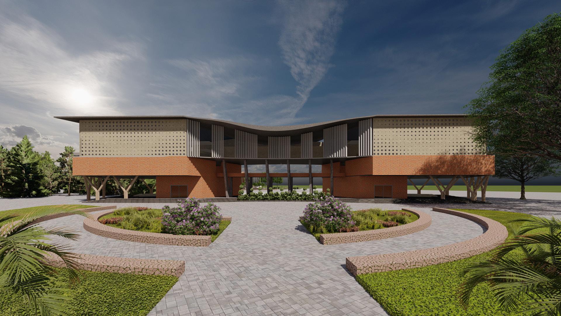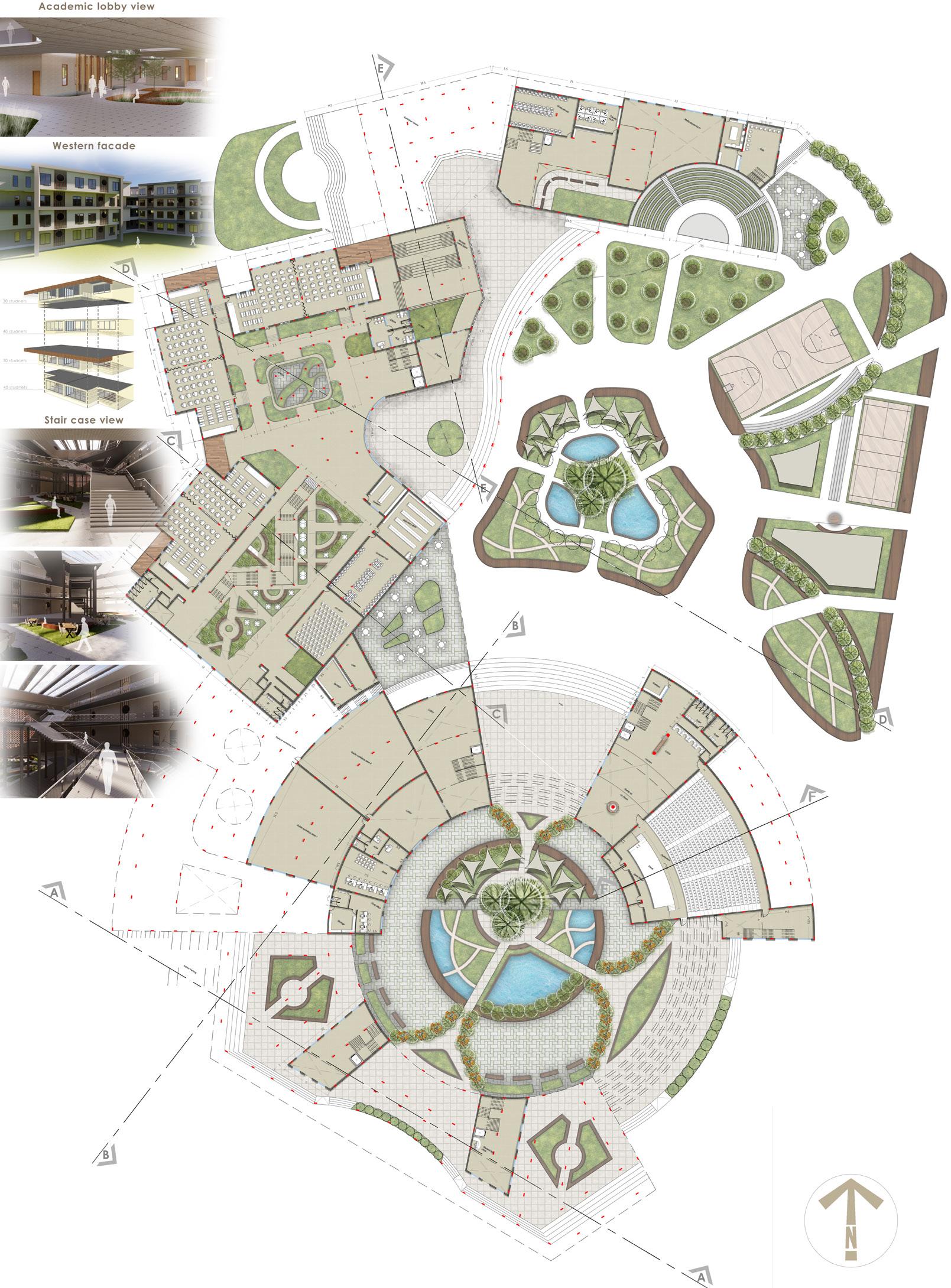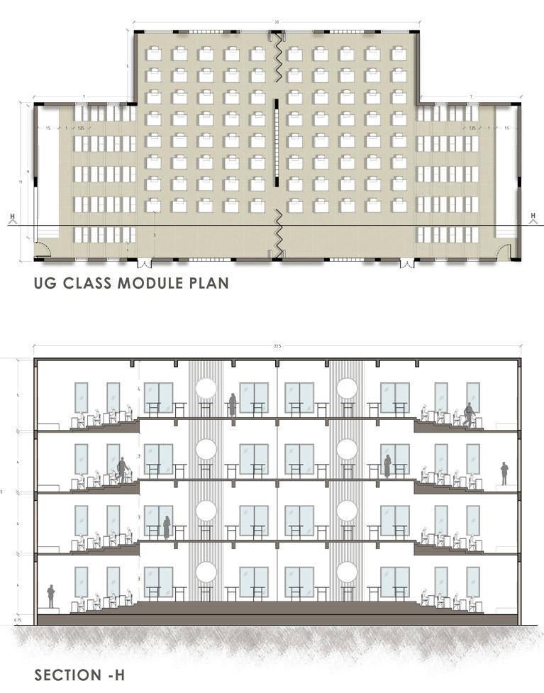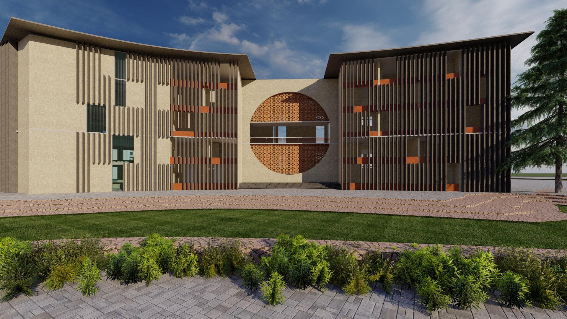 Academic block integrated with semi-public courtyard and outdoor seating facilities.The facade houses the design street, which is seen as a prominent vibrant feature on approaching the building.