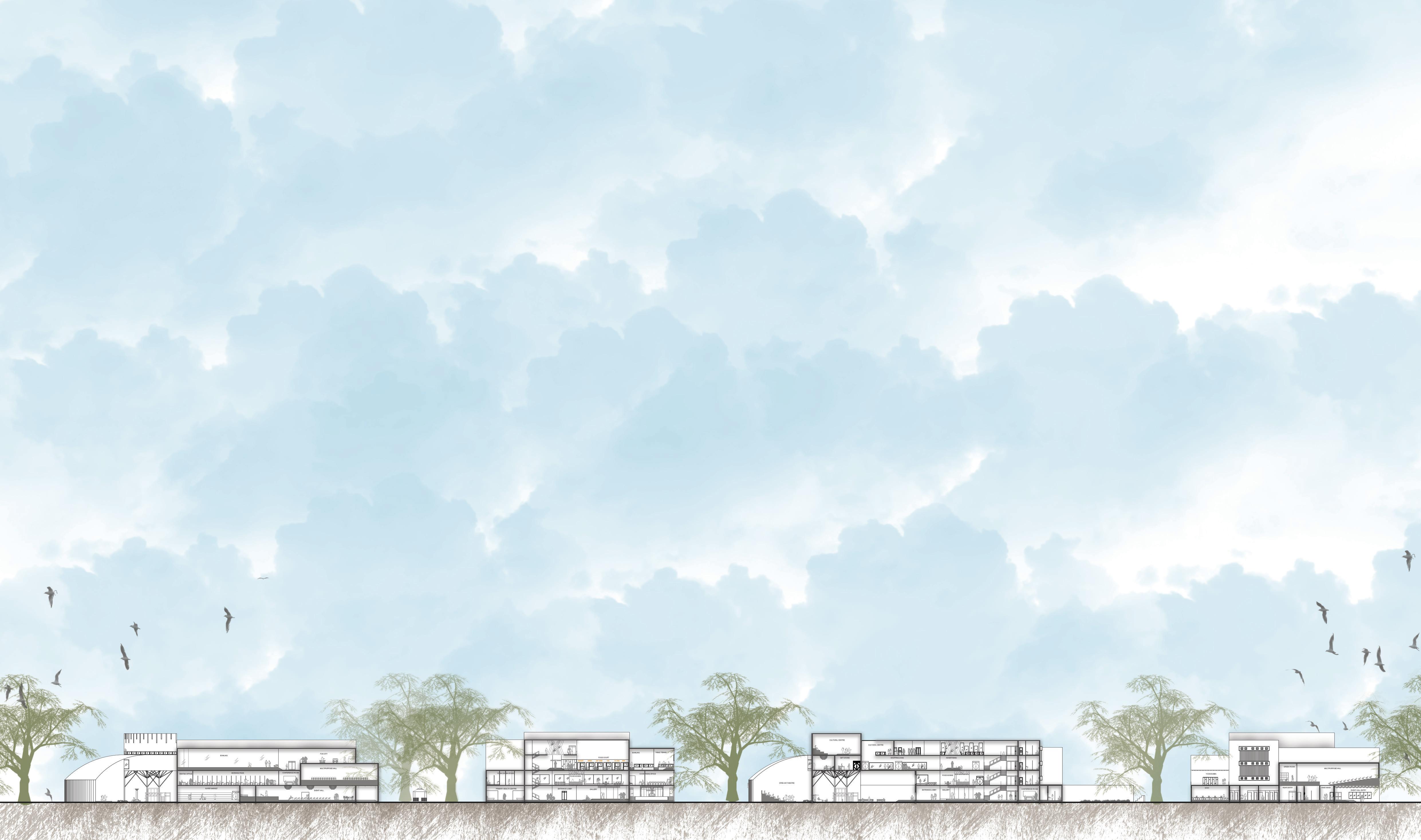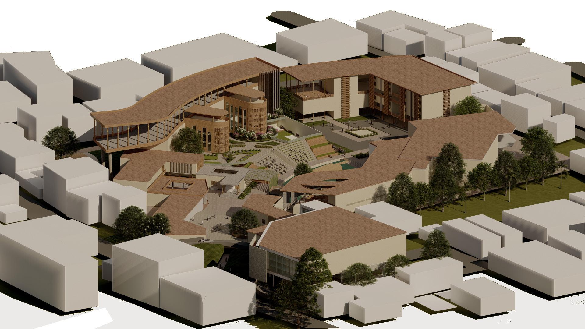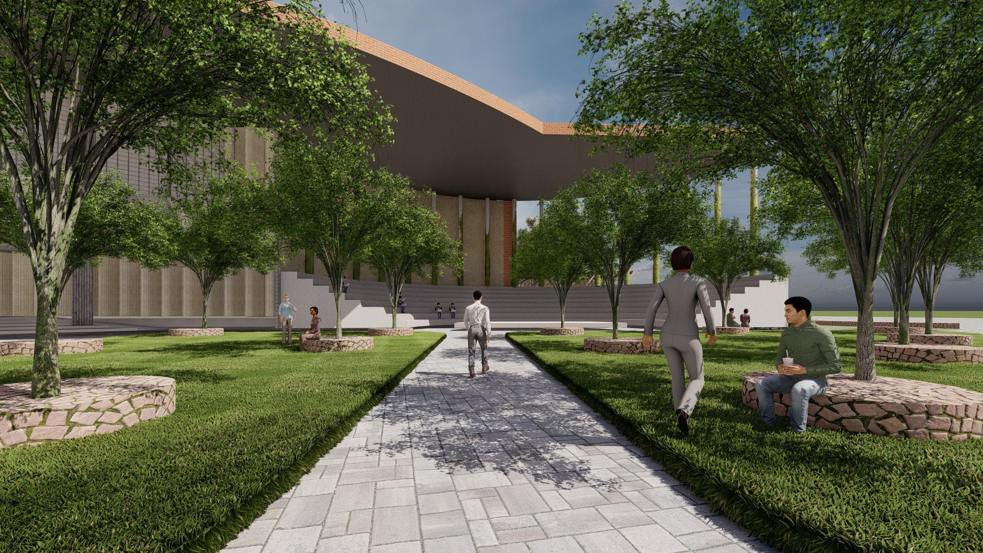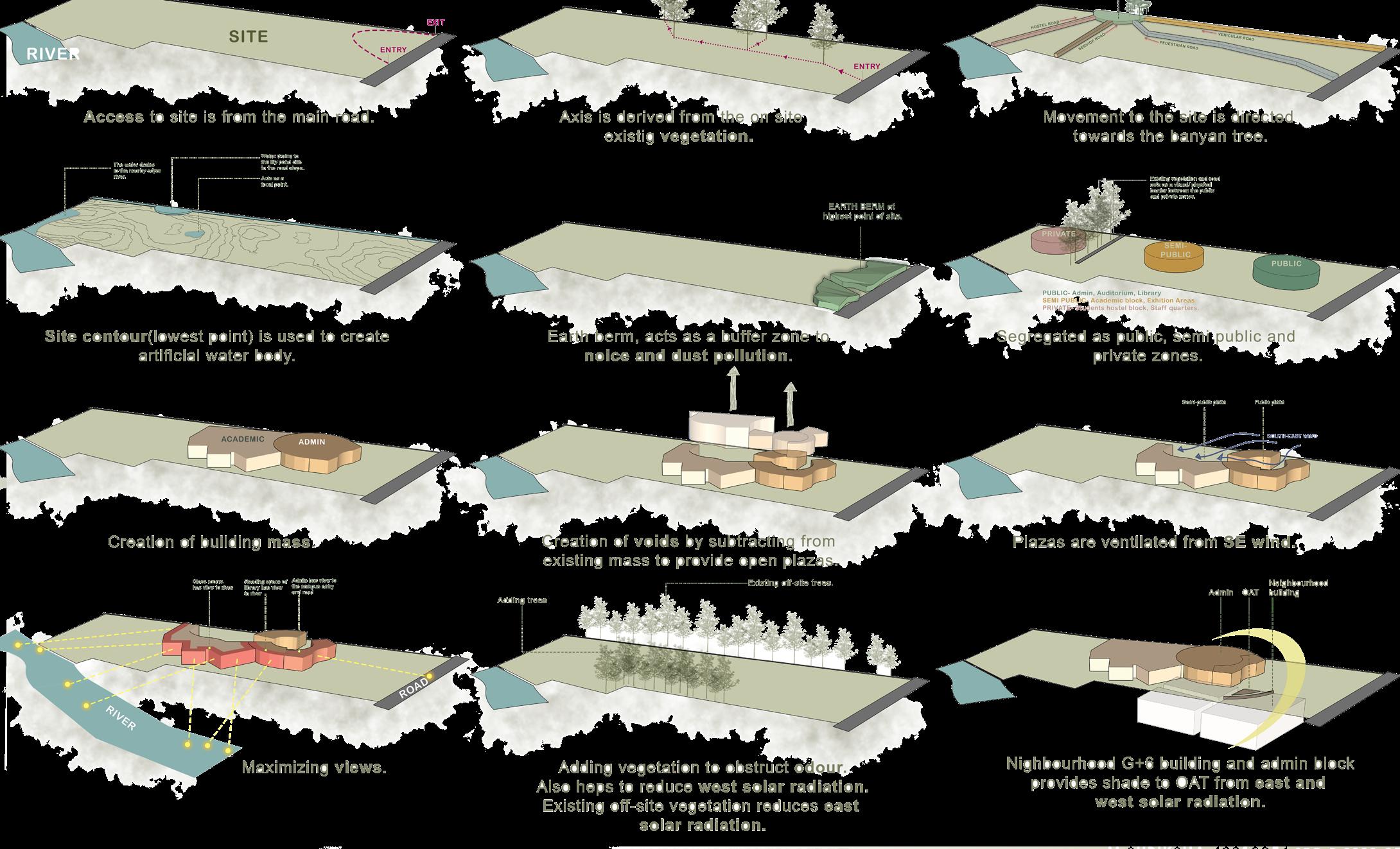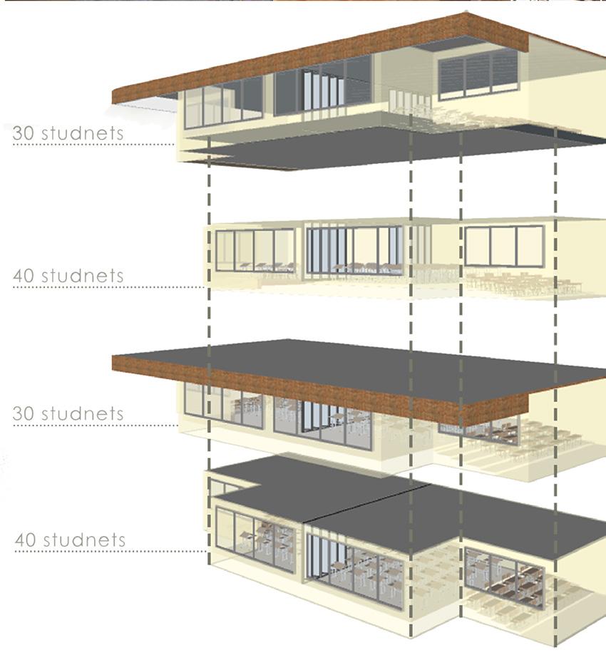 Academic block integrated with semi-public courtyard and outdoor seating facilities.The facade houses the design street, which is seen as a prominent vibrant feature on approaching the building.