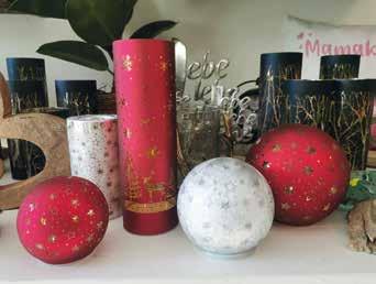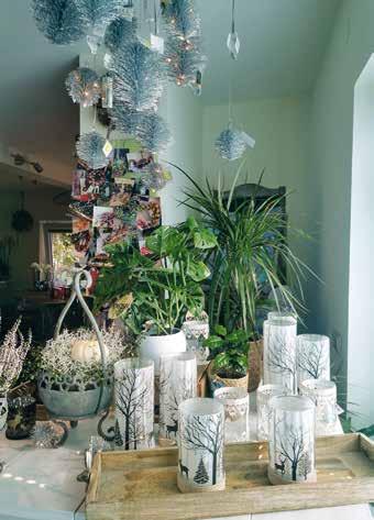 vollen Tischlampen, mit Gold verzierte Weihnachtskugeln aus Holz, Weihnachtskerzen, Blechschildern und natürlich florale und kreative Adventsgestecke. LED-Lichterketten in Form von Schneekugeln in Silber zaubern ebenfalls ein besonders schönes vorweihnachtliches Ambiente. Auch wenn dieses Jahr die Ad ventsausstellung bei Rosen-Holz am Samstag vor Totensonntag mit Glühwein und Punsch leider aus Kapazitätsgründen ausfällt, die vorweihnachtliche Stimmung zum Glück aber nicht.