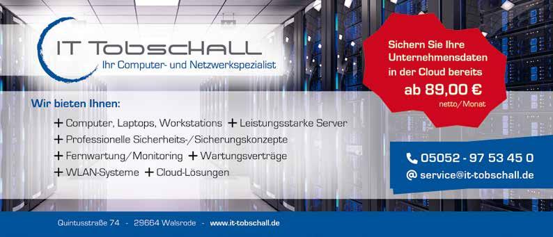 Dieser Frage gehen Stephan Tobschall und seine Mitarbeiter auf den Grund. Denn das IT-Unternehmen aus Walsro de steht Privat- und Geschäftskunden im Landkreis Celle und im Heidekreis seit über zwölf Jahren in allen Belangen rund ums Thema EDV mit Rat und Tat zur Seite. Ob Homeschooling, Home Office oder der moderne Büroalltag – die Digitalisie rung erlebt einen Aufschwung, was viele Veränderungen mit sich bringt. Auch die Corona Pandemie hat unsere Gesellschaft vor neue Herausforderungen und Voraus setzungen im Bereich der Technik gestellt. Über diese Entwicklung berichtete Stephan Tobschall, Inhaber von IT-Tobschall, bereits in unserer Ausgabe 5-2021. Zuverlässig keit, Ausfallsicherheit und Verfügbarkeit von IT-Systemen gewinnen immer mehr an Bedeutung. Auch die Sicherheit und Funk tionalität der Endgeräte ist nach wie vor ein enorm wichtiges Thema für Unternehmen.