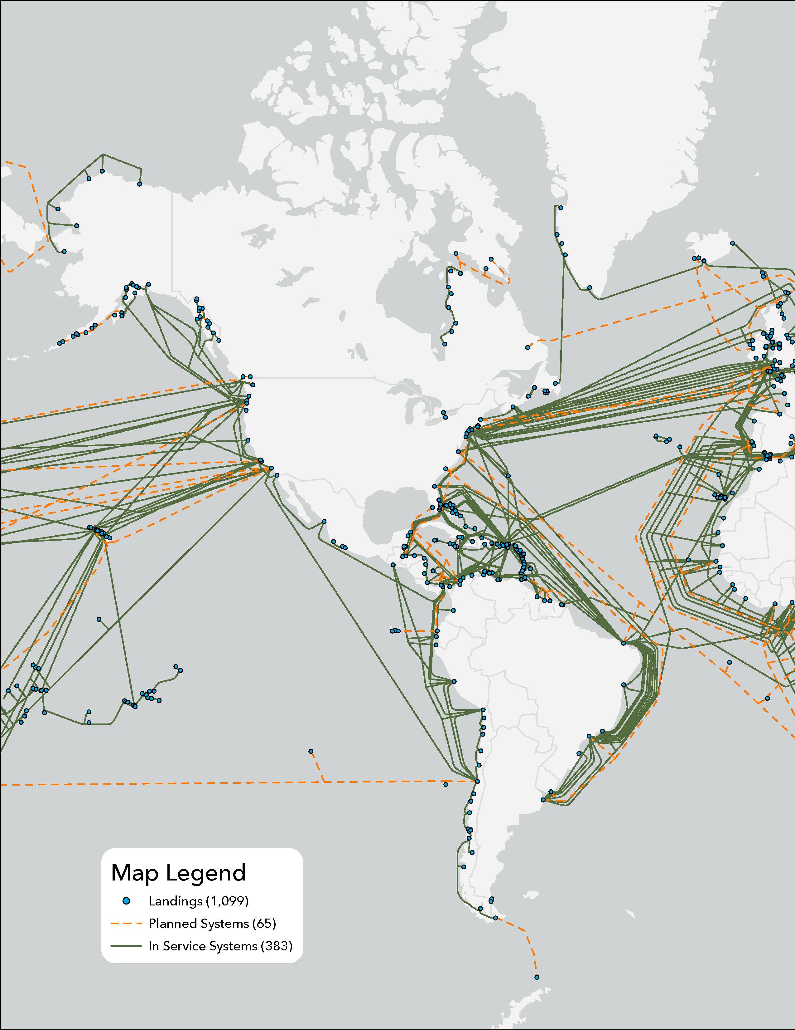 This edition of the Submarine Telecoms Cable Almanac was authored by the analysts at Submarine Telecoms Forum, Inc. who provide submarine cable system analysis for SubTel Forum’s Submarine Cable Almanac, online and print Cable Maps and Industry Newsfeed. For the Submarine Cable Almanac, we utilized both interviews with industry experts and our proprietary Submarine Cable Database which was purpose-built by Submarine Telecoms Forum in 2013 and updated in 2021. The database tracks more than 500 current and planned domestic and international cable systems, including project information suitable for querying by client, year, project, region, system length, capacity, landing points, data centers, owners, installers, etc. The Submarine Cable Database is purposebuilt by a dedicated database administration team, powered by SQL. Maps are produced with ArcGIS Pro, in the same format and visual style as the Submarine Cables of the World print map.