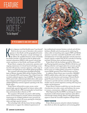 key multinational customer business verticals and will also facilitate eHealth and eLearning and, by onshoring the subsea cable via branching units, support NBN and Mobile operators to provide contestable bandwidth north of Perth and deployment of new high speed data network and transmission capacity coupled with 4G/5G networks for floating and fixed oil & gas assets and fixed mining assets. Project Koete will also facilitate growth for WA’s existing Floating liquefied natural gas (FLNG), Oil & Gas and Mining industries and support plans for economic growth in jobs, tourism, science and industry. WA’s offshore Oil & Gas assets are seeking global connectivity to facilitate remote M2M operations from USA, Europe and Asia. In addition, Project Koete aims to provide a SMART/ OBOS enabled subsea cable that can support qualified needs for early detection and warning of Seismic/Earthquake/Tsunami activity and can monitor the ocean environment to provide real time scientific data regarding weather and sea animal migrations assisting with long term studies and development. Project Koete’s business model does not own the means of production, but rather creates and facilitates the means to connect, communicate, collaborate and participate. Fibre Expressway Pty Ltd (FEPL) can leverage its outsourcing business model and past project experience and is able to work through existing strategic alliances with global industry experts to ensure the successful completion of Project Koete.