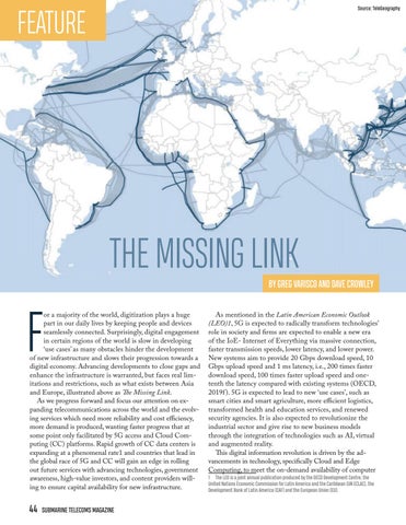 As mentioned in the Latin American Economic Outlook (LEO)1, 5G is expected to radically transform technologies’ role in society and firms are expected to enable a new era of the IoE- Internet of Everything via massive connection, faster transmission speeds, lower latency, and lower power. New systems aim to provide 20 Gbps download speed, 10 Gbps upload speed and 1 ms latency, i.e., 200 times faster download speed, 100 times faster upload speed and onetenth the latency compared with existing systems (OECD, 2019f ). 5G is expected to lead to new ‘use cases’, such as smart cities and smart agriculture, more efficient logistics, transformed health and education services, and renewed security agencies. It is also expected to revolutionize the industrial sector and give rise to new business models through the integration of technologies such as AI, virtual and augmented reality. This digital information revolution is driven by the advancements in technology, specifically Cloud and Edge Computing, to meet the on-demand availability of computer 1 The LEO is a joint annual publication produced by the OECD Development Centre, the United Nations Economic Commission for Latin America and the Caribbean (UN ECLAC), the Development Bank of Latin America (CAF) and the European Union (EU).