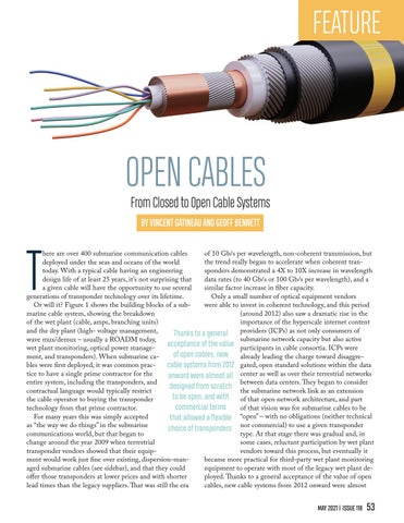 of 10 Gb/s per wavelength, non-coherent transmission, but here are over 400 submarine communication cables the trend really began to accelerate when coherent trandeployed under the seas and oceans of the world sponders demonstrated a 4X to 10X increase in wavelength today. With a typical cable having an engineering data rates (to 40 Gb/s or 100 Gb/s per wavelength), and a design life of at least 25 years, it’s not surprising that similar factor increase in fiber capacity. a given cable will have the opportunity to use several Only a small number of optical equipment vendors generations of transponder technology over its lifetime. were able to invest in coherent technology, and this period Or will it? Figure 1 shows the building blocks of a sub(around 2012) also saw a dramatic rise in the marine cable system, showing the breakdown importance of the hyperscale internet content of the wet plant (cable, amps, branching units) providers (ICPs) as not only consumers of and the dry plant (high- voltage management, Thanks to a general submarine network capacity but also active wave mux/demux – usually a ROADM today, acceptance of the value participants in cable consortia. ICPs were wet plant monitoring, optical power manageof open cables, new already leading the charge toward disaggrement, and transponders). When submarine cables were first deployed, it was common praccable systems from 2012 gated, open standard solutions within the data tice to have a single prime contractor for the onward were almost all center as well as over their terrestrial networks between data centers. They began to consider entire system, including the transponders, and designed from scratch the submarine network link as an extension contractual language would typically restrict to be open, and with of that open network architecture, and part the cable operator to buying the transponder commercial terms of that vision was for submarine cables to be technology from that prime contractor. For many years this was simply accepted that allowed a flexible “open” – with no obligations (neither technical as “the way we do things” in the submarine choice of transponders. nor commercial) to use a given transponder type. At that stage there was gradual and, in communications world, but that began to some cases, reluctant participation by wet plant change around the year 2009 when terrestrial vendors toward this process, but eventually it transponder vendors showed that their equipbecame more practical for third-party wet plant monitoring ment would work just fine over existing, dispersion-manequipment to operate with most of the legacy wet plant deaged submarine cables (see sidebar), and that they could ployed. Thanks to a general acceptance of the value of open offer those transponders at lower prices and with shorter cables, new cable systems from 2012 onward were almost lead times than the legacy suppliers. That was still the era MAY 2021 | ISSUE 118
