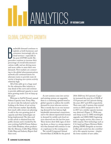 2016-2020 was 10.3 percent. Capacity increased the most by a CAGR of 13.8 percent and 14.2 percent during the years 2017 and 2018, respectively. There were only 9 systems that entered service in 2018 compared to the 15 in 2017 yet a similar capacity increase was observed. (Figure 1) With easy and cheap access to 100G wavelength upgrades and 200G/400G beginning to enter regular service, this comes as little surprise. New technology such as C+L band and Space Division Multiplexing (SDM) alongside an increase in fiber pair counts has also contributed to this capacity increase – despite the lower number of new cables.