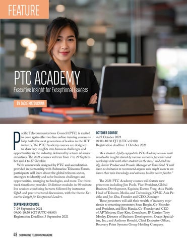 acific Telecommunications Council (PTC) is excited to once again offer two live online training courses to help build the next generation of leaders in the ICT industry. The PTC Academy courses are designed to share key insights into business challenges and opportunities in the industry, delivered by a team of senior executives. The 2021 courses will run from 7 to 29 September and 4 to 27 October. With coursework designed by PTC and accreditation provided in partnership with Submarine Telecoms Forum, participants will learn about the global telecom sector, strategies to identify and solve business challenges and opportunities, emerging technologies, and more. The threeweek timeframe provides 10 distinct modules in 90-minute live sessions combining lectures followed by instructor Q&A and peer structured discussions, with the theme Executive Insight for Exceptional Leaders.
