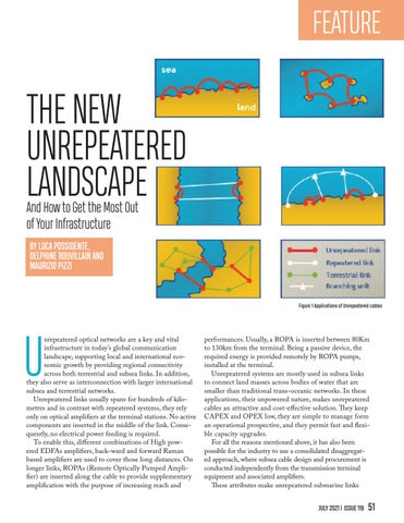 performances. Usually, a ROPA is inserted between 80Km to 130km from the terminal. Being a passive device, the required energy is provided remotely by ROPA pumps, installed at the terminal. Unrepeatered systems are mostly used in subsea links to connect land masses across bodies of water that are smaller than traditional trans-oceanic networks. In these applications, their unpowered nature, makes unrepeatered cables an attractive and cost-effective solution. They keep CAPEX and OPEX low, they are simple to manage form an operational prospective, and they permit fast and flexible capacity upgrades. For all the reasons mentioned above, it has also been possible for the industry to use a consolidated disaggregated approach, where subsea cable design and procurement is conducted independently from the transmission terminal equipment and associated amplifiers. These attributes make unrepeatered submarine links JULY 2021 | ISSUE 119
