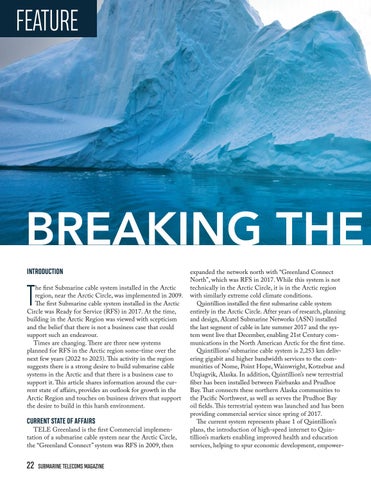 expanded the network north with “Greenland Connect North”, which was RFS in 2017. While this system is not technically in the Arctic Circle, it is in the Arctic region with similarly extreme cold climate conditions. Quintillion installed the first submarine cable system entirely in the Arctic Circle. After years of research, planning and design, Alcatel Submarine Networks (ASN) installed the last segment of cable in late summer 2017 and the system went live that December, enabling 21st Century communications in the North American Arctic for the first time. Quintillions’ submarine cable system is 2,253 km delivering gigabit and higher bandwidth services to the communities of Nome, Point Hope, Wainwright, Kotzebue and Utqiagvik, Alaska. In addition, Quintillion’s new terrestrial fiber has been installed between Fairbanks and Prudhoe Bay. That connects these northern Alaska communities to the Pacific Northwest, as well as serves the Prudhoe Bay oil fields. This terrestrial system was launched and has been providing commercial service since spring of 2017. The current system represents phase 1 of Quintillion’s plans, the introduction of high-speed internet to Quintillion’s markets enabling improved health and education services, helping to spur economic development, empower-