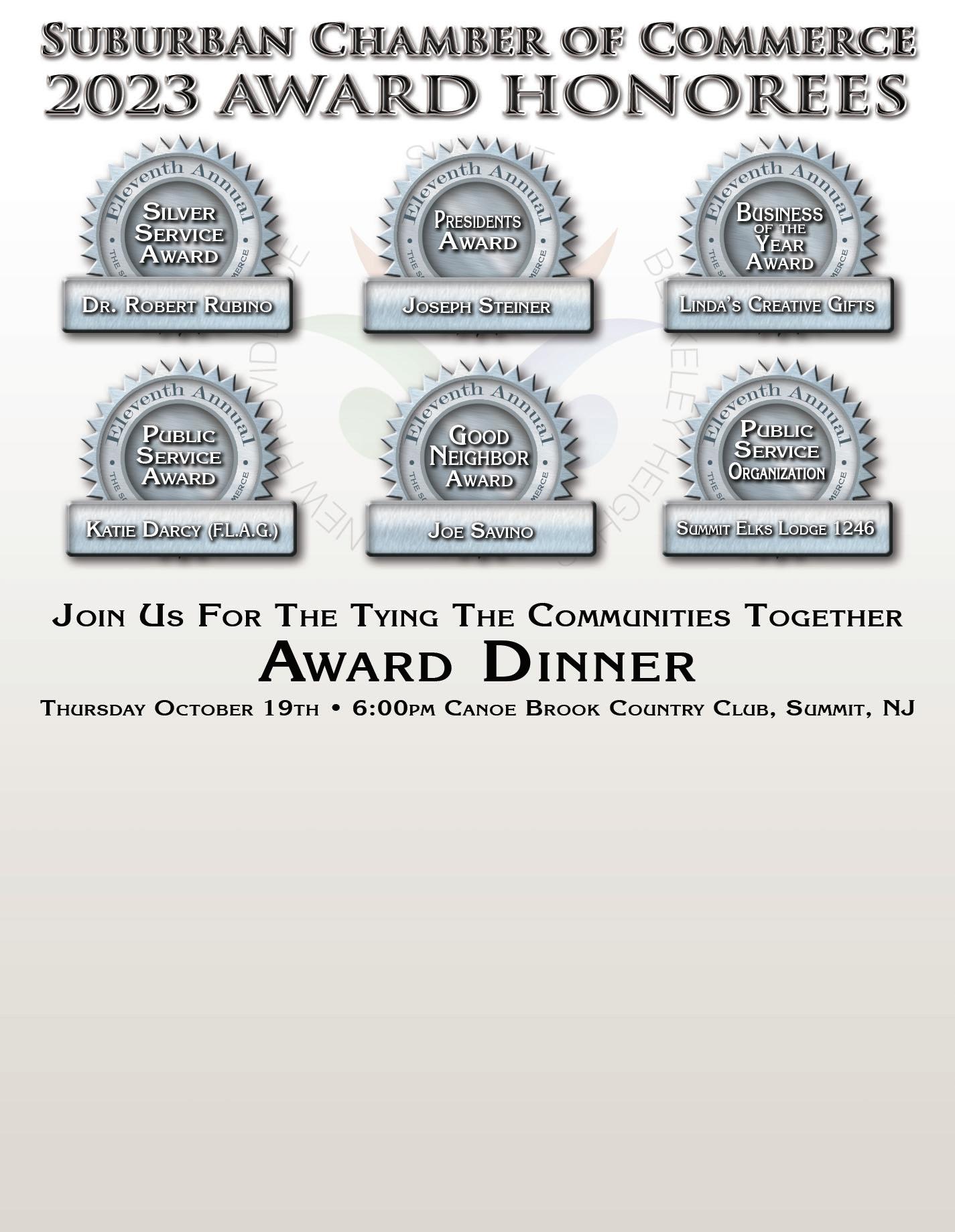 The community is invited to the annual Service Awards Dinner hosted by the Suburban Chamber of Commerce on Thursday, Oct. 19, at Canoe Brook Country Club in Summit, where a 6 p.m. reception will be followed by dinner at 7. All are welcome not only to attend and support the local business community, but are encouraged to pay tribute to their friends, merchants and neighbors who go the extra mile to make local communities the special places they are.