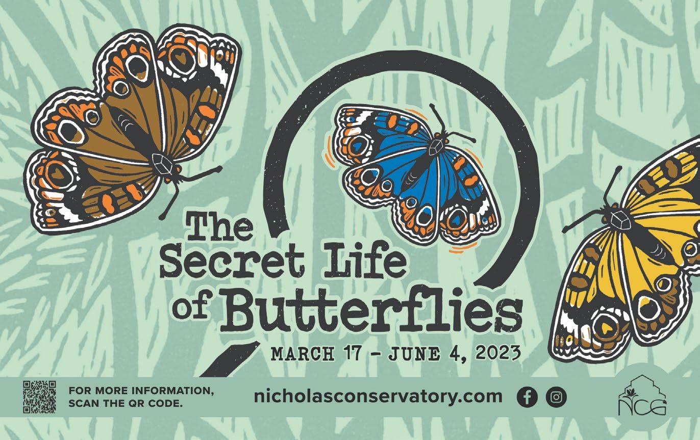 Secret Life of Butterflies – March 17 - June 4 Join us to explore the wild, wonderful, and often strange world of butterflies and moths! See the whole lepidoptera lifecycle in action as caterpillars munch on leaves, butterflies emerge from their chrysalis, and moths from their cocoons. Get an up-close look at these amazing insects in the butterfly house as you’re surrounded by native and exotic butterflies! Located at Rockford Park District’s Nicholas Conservatory & Gardens, 1354 N. Second St. Rockford, IL. www.nicholasconservatory.com/butterflies [See our ad on the Inside Back Cover.]