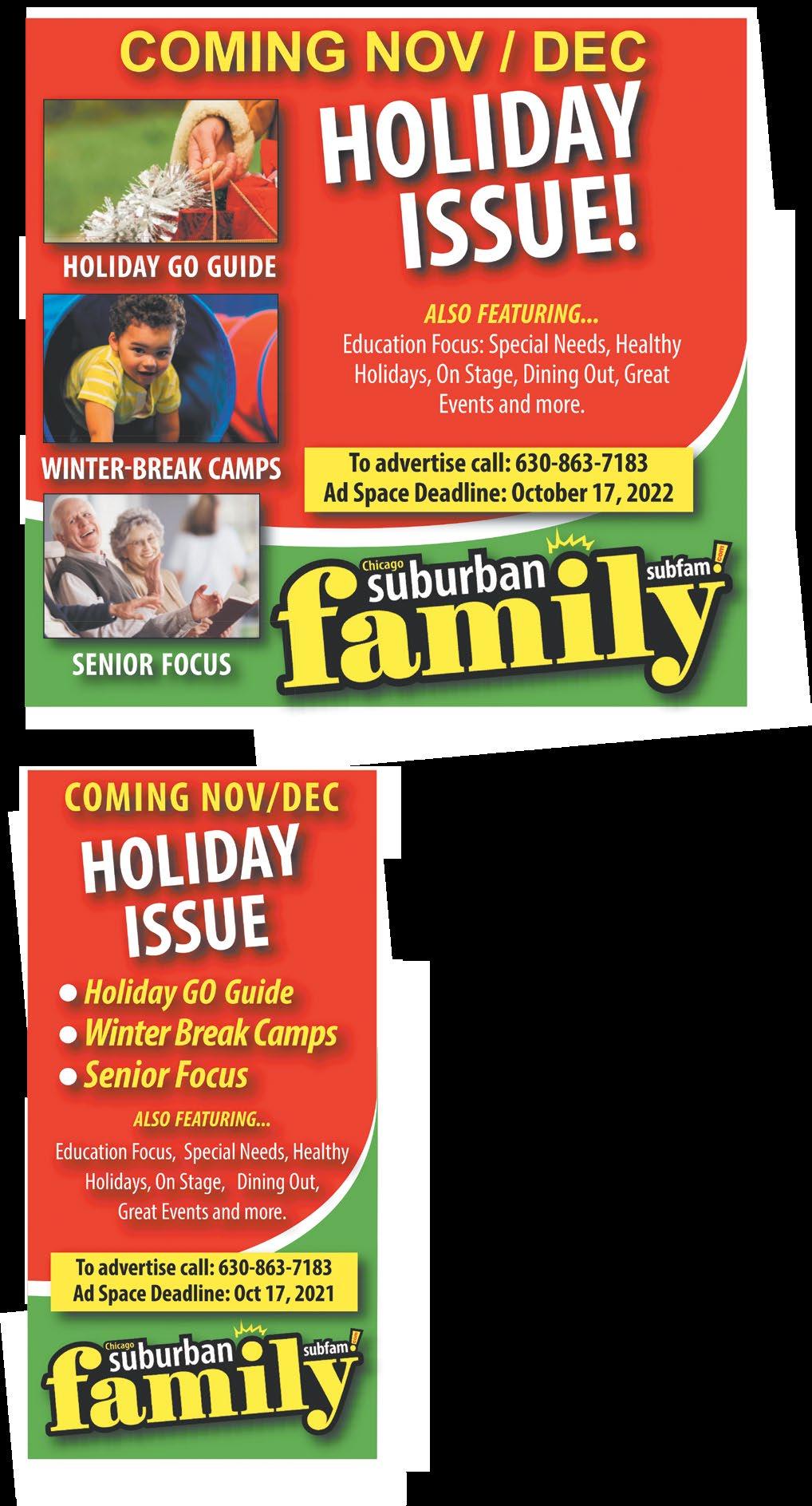 Suburban Family is published bi-monthly by Jameson Pub lishing, Inc. and is distributed free to the public through quality locations in the Chicago suburbs. The full edition is online at subfam.com and chicagosuburbanfamily.com.