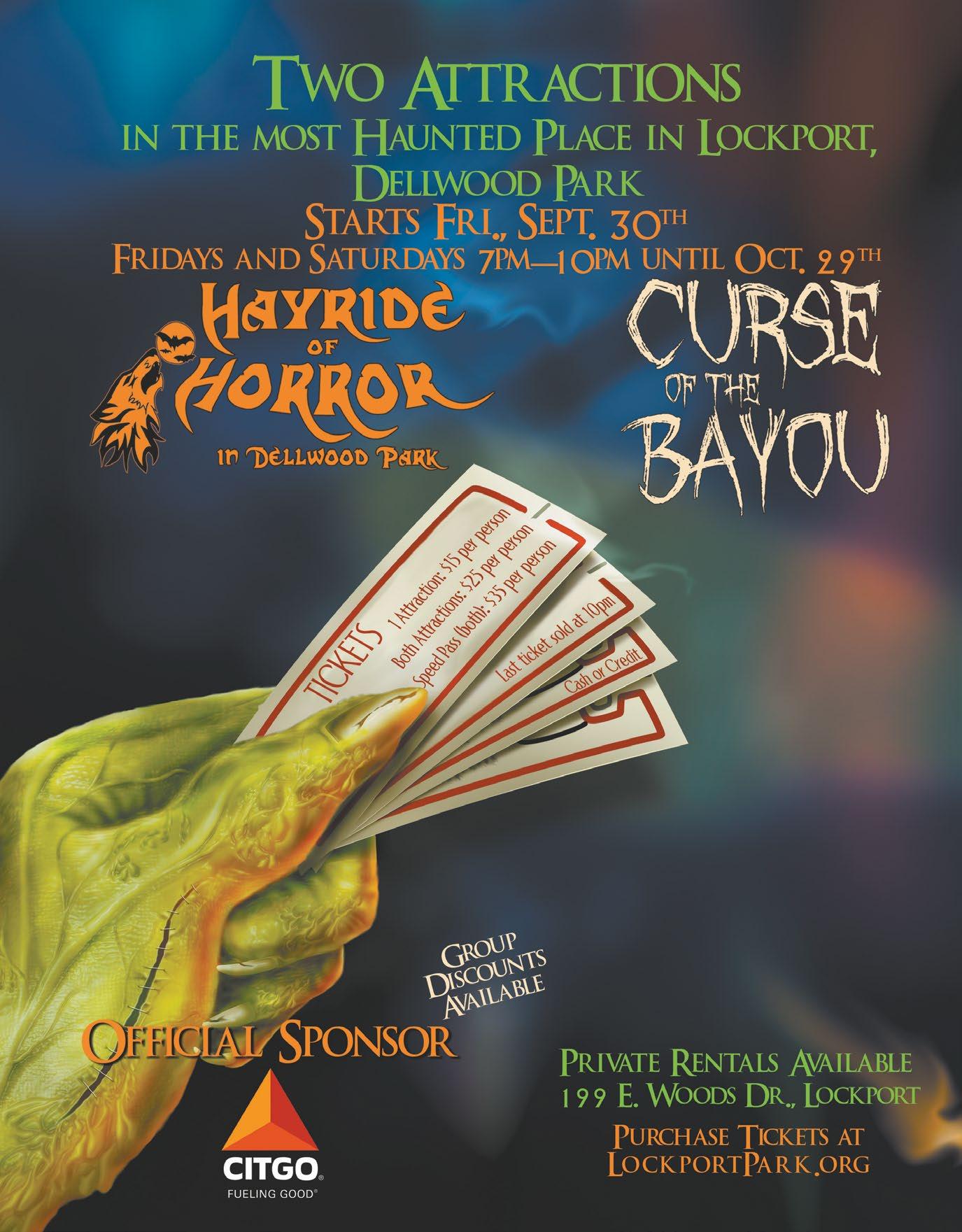 The Lockport Township Park District presents the Hayride of Horror and Curse of the Bayou every Fri. and Sat. starting Sept. 30 until Oct. 29 from 7pm-10pm (last ticket sold at 10pm) at Dellwood Park, 199 E. Woods Dr. in Lock port. Tickets can be purchased at www.lockportpark.org and fees are as follows: one attraction: $15 per person; $25 both attractions: $35 speed pass to both attractions. Group dis counts and private rentals are available. Both events are sponsored by CITGO. Lockport. For more info., visit www.lockportpark.org or call 815-838-1183.