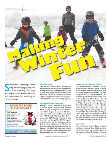 Antique Show Save the date! March 5, 6 & 7. Searching for hidden treasures? You’ll uncover: exquisite furnishings, linens, lace & jewelry, books, art, rugs & silver. Many prestigious dealers all housed in Emmanuel Church, an architectural wonder. 203 S. Kensington Ave. in historic LaGrange, IL 708-352-1275. wwww.emmanuel-lagrange.org DuPage Children’s Museum DuPage Children’s Museum is more than a museum, we’re a force for early learning! Learn and play in “neighborhoods” of handson exhibits designed to promote skill development in math, science, and the arts. Don’t miss XOXO: An Exhibit about Love & Forgiveness (at DCM through February 1). Fun, interactive and thoughtful...XOXO is a powerful, interactive way for families to explore feelings of love and forgiveness. Watch for information about the new exhibit opening on February 14, 2015; Math Playground. Check out the museum today, www.dupagechildrensmuseum.org or call 630.637.8000. suburban family | subfam.com