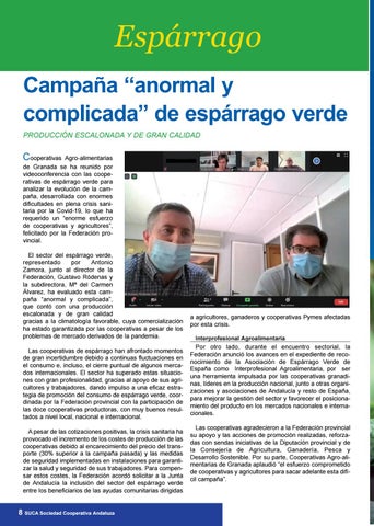 Agro-alimentarias de Granada se ha reunido por videoconferencia con las cooperativas de espárrago verde para analizar la evolución de la campaña, desarrollada con enormes dificultades en plena crisis sanitaria por la Covid-19, lo que ha requerido un “enorme esfuerzo de cooperativas y agricultores”, felicitado por la Federación provincial. El sector del espárrago verde, representado por Antonio Zamora, junto al director de la Federación, Gustavo Ródenas y la subdirectora, Mª del Carmen Álvarez, ha evaluado esta campaña “anormal y complicada”, que contó con una producción escalonada y de gran calidad gracias a la climatología favorable, cuya comercialización ha estado garantizada por las cooperativas a pesar de los problemas de mercado derivados de la pandemia. Las cooperativas de espárrago han afrontado momentos de gran incertidumbre debido a continuas fluctuaciones en el consumo e, incluso, el cierre puntual de algunos mercados internacionales. El sector ha superado estas situaciones con gran profesionalidad, gracias al apoyo de sus agricultores y trabajadores, dando impulso a una eficaz estrategia de promoción del consumo de espárrago verde, coordinada por la Federación provincial con la participación de las doce cooperativas productoras, con muy buenos resultados a nivel local, nacional e internacional. A pesar de las cotizaciones positivas, la crisis sanitaria ha provocado el incremento de los costes de producción de las cooperativas debido al encarecimiento del precio del transporte (30% superior a la campaña pasada) y las medidas de seguridad implementadas en instalaciones para garantizar la salud y seguridad de sus trabajadores. Para compensar estos costes, la Federación acordó solicitar a la Junta de Andalucía la inclusión del sector del espárrago verde entre los beneficiarios de las ayudas comunitarias dirigidas