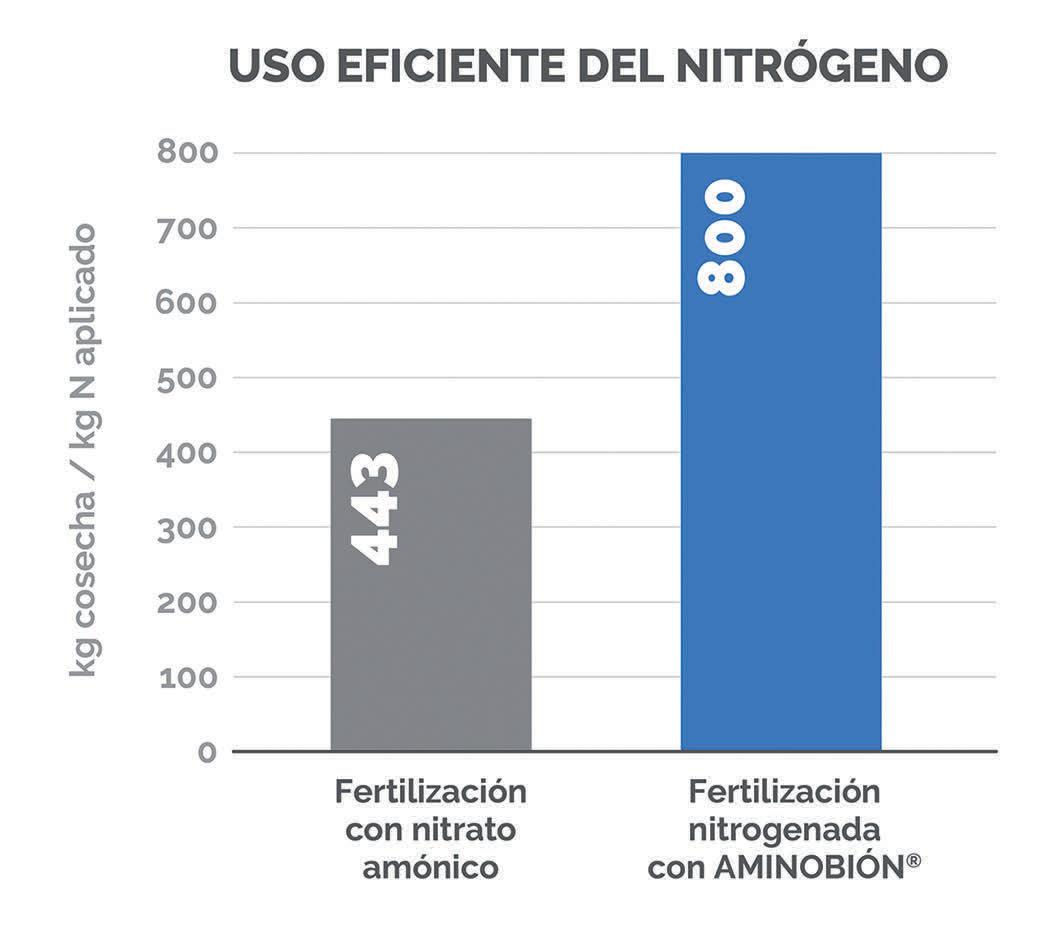 Por otro lado, AMINOBIÓN® tiene un segundo efecto, ya que su aplicación en la rizosfera mejora los procesos de absorción y asimilación del nitrógeno por el cultivo, lo que redunda en una mayor eficiencia de uso de este nutriente.