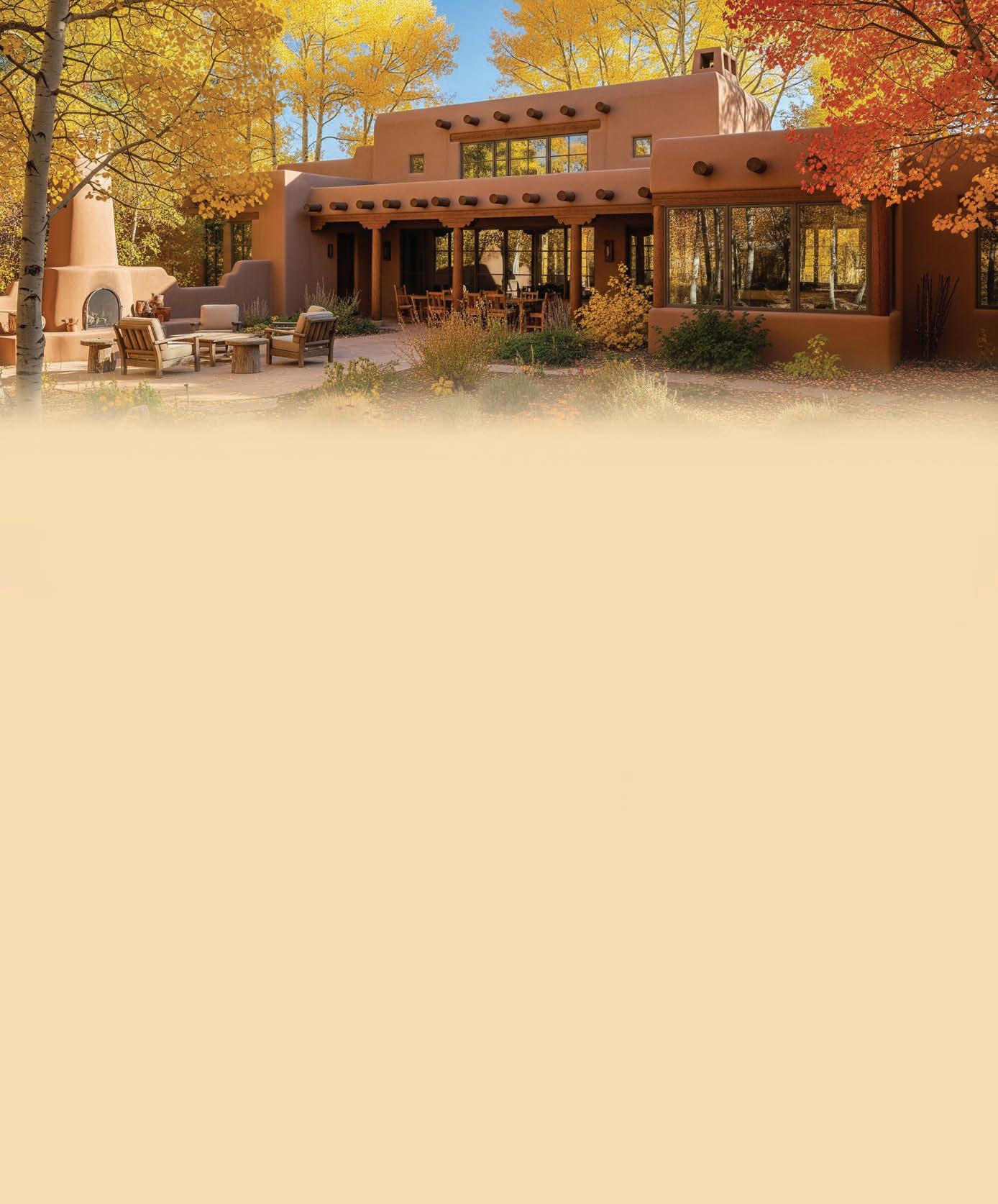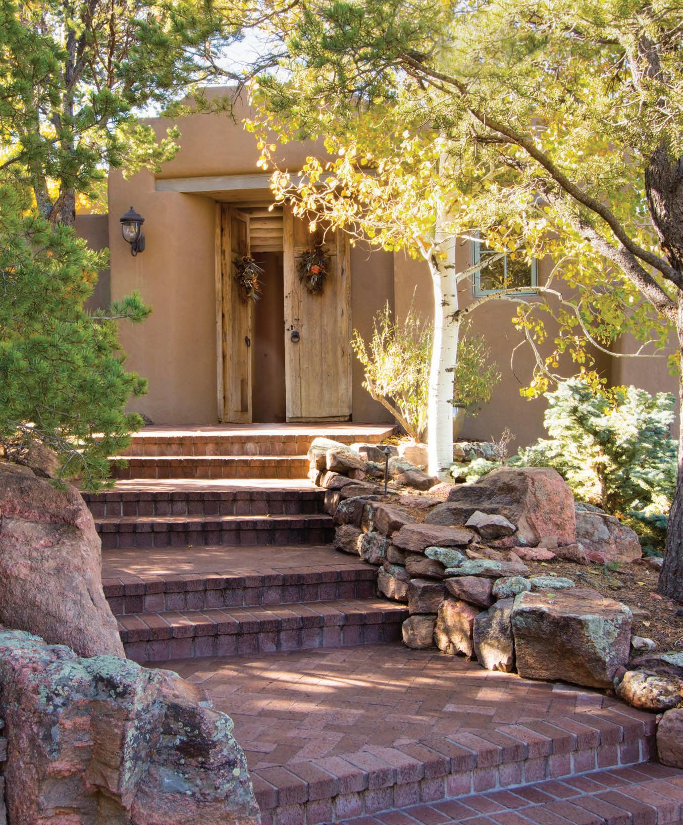 Late afternoon light spills like honey over the adobe walls of this Santa Fe home—a perfect moment in time. The wooden doors, weathered and proud, catch the glow, their decor whispering of autumn’s arrival. A crisp breeze stirs the aspen leaves, scattering flashes of gold against the russet stone pathway. Shadows from the pines stretch long and dappled, guiding the eye upward along the herringbone brick steps. The rocks framing the entrance retain the sun’s last heat, grounding the scene in earthy permanence. It’s a fleeting moment—where amber-colored leaves, golden light and rustic textures converge—captured just before twilight takes over.