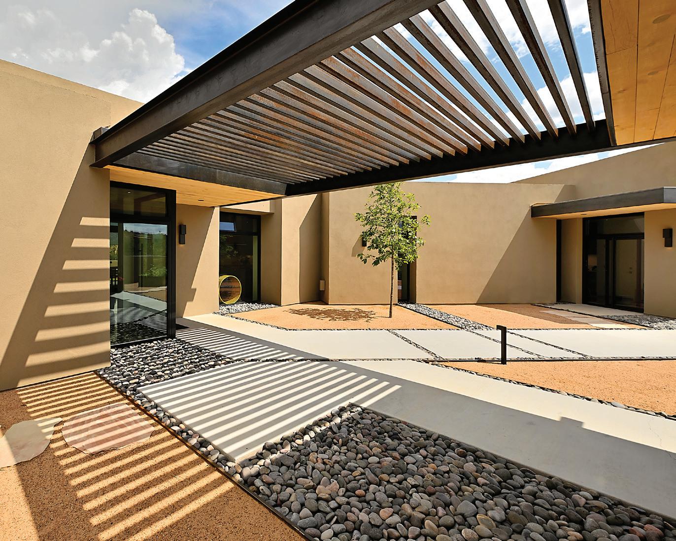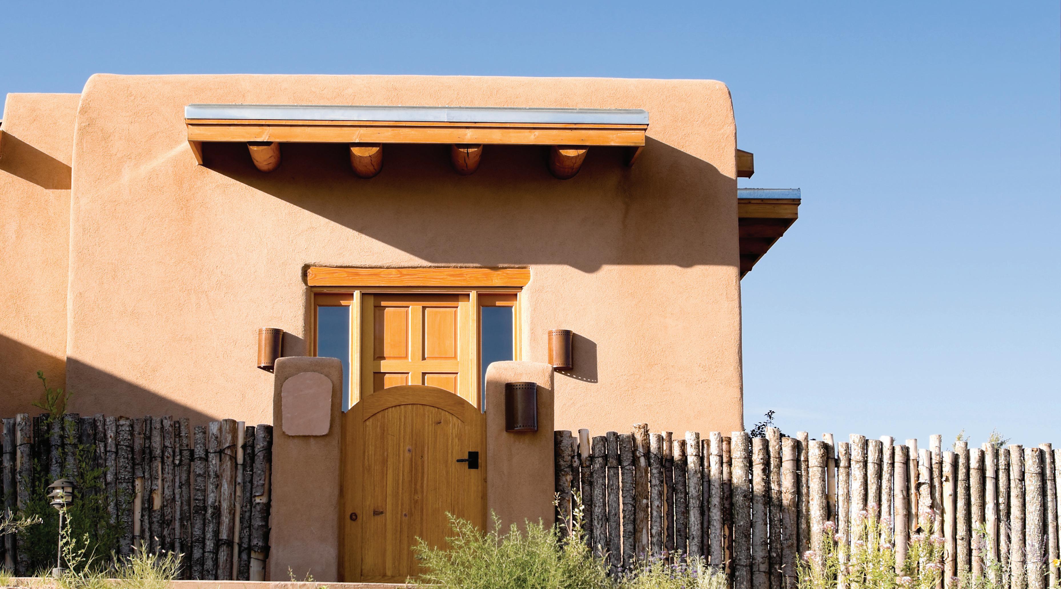 “I was just struck with the simple beauty of the construction of this portal— the clean lines, the shadow and light play, and the view of the Jemez Mountains,” she says. The materials and hand-hewn aesthetic exemplify New Mexico style, while capturing the views is paramount to our local homebuilding ethos.