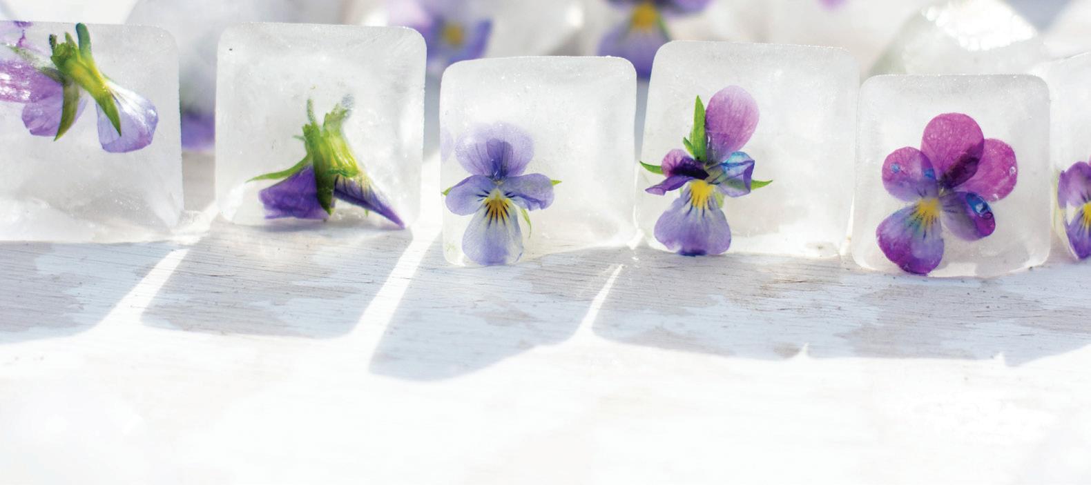 Stunning frozen florals are also easy, starting with artfully arranged selections in large ice cube trays. Use filtered or boiled (and cooled) water for clear cubes. While freezing can minimize alreadyfaint flavor, these are playful additions for warm-weather parties, especially gorgeous in clear cocktails.