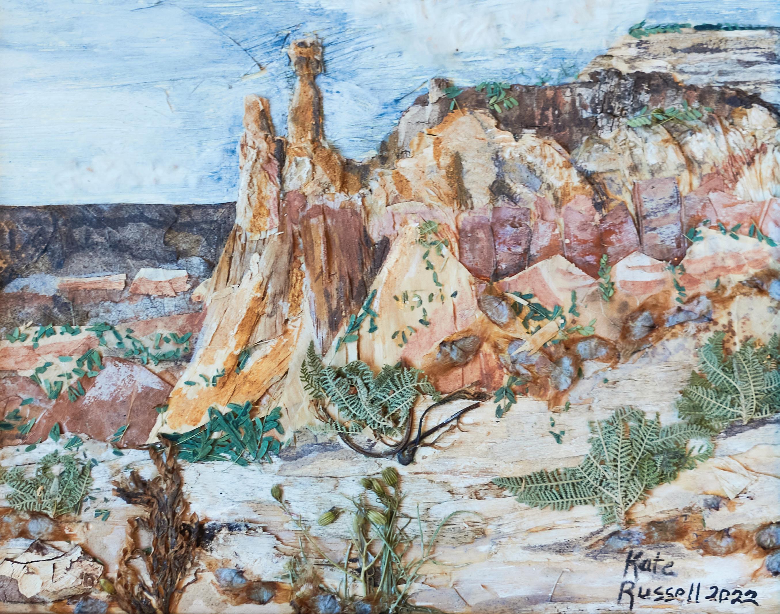 Today, Russell includes bits of New Mexico’s landscape in her work.
