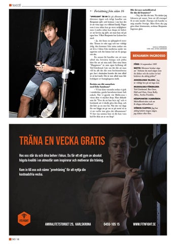 Fortsättning från sidan 16 låt på albumet som däremot öppet och ärligt handlar om Benjamin själv och bottnar i om hur det är att växa upp i en välkänd familj. Något som å ena sidan kan ge stora möjligheter men å andra sidan kan skapa ett behov av att bevisa sig själv, att man kan stå på egna ben. Vilket Benjamin har lyckats bra med. – Ja, det finns en själupplevd story där. Texten är rakt upp och ner väldigt ärlig, den kommer från mina tankar om att leva i fokus från medierna under sin uppväxt och det känns kul att få sjunga om det. En annan låt handlar om att man alltid ska fortsätta kämpa och jobba hårt för att nå sina mål. Den sista låten ”Happiness” är min egen hyllning till Ted Gärdestad. Lite om det där att man vill ha allt det där som berömmelserna ger, fast i slutändan kanske det inte alltid är så kul ändå. Det är inte alltid man blir lyckligare av framgångarna ändå. ”SPOTLIGHT” ÄR EN