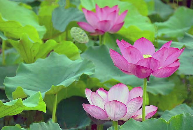 在本地,溫哥華水池所見到 的多數是蓮花。荷葉很大塊,可 以拿來遮頭擋雨。荷花在夏天開 放,荷盡,顯示夏天已經過去了。