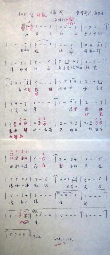 拾級而上,果然,二樓是有歷史 的音樂社,墻上是社團多年在各地 演出的照片。一位較年長的姐姐, 見我們是年輕人,十分開心,帶我 們參觀一圈後,邀請我們入練習 室,看將開始的排練曲目。練習室 中央,兩位姐姐已投入在故事的角 色、唱腔及唸白中。身旁的姐姐, 看來資歷已不淺。她循著音樂,對 著曲譜,耐心向我解釋種種標注及