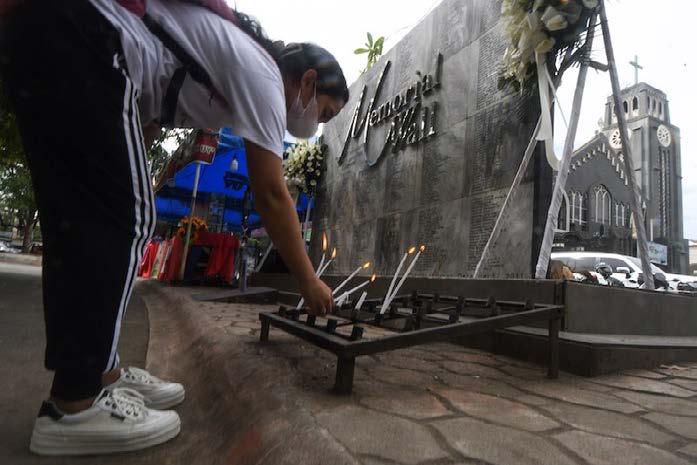 REMEMBERING SENDONG. A woman lights a candle at the Sendong Memorial Wall in Cagayan de Oro City on Friday, Dec. 16, 2022. The wall contains a list of the dead and the missing due when typhoon Sendong struck this city on December 16, 2011.