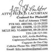4. Plaintiff is of legal age, Filipino, married, resident of Mendoza Compound, Patag, Cagayan de Oro City, he is a retired member of the Philippine National Police (PNP), his attorney-in-fact is his son Gheni Mark Tadena, of legal age, Filipino, married, also a resident of Mendoza Compound, Patag, Cagayan de Oro city: SPA is Exhibit A: