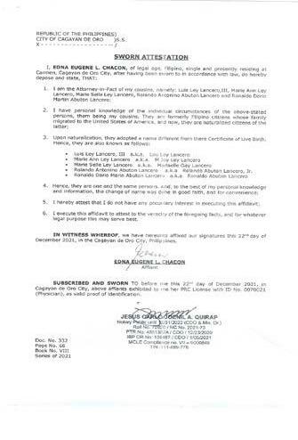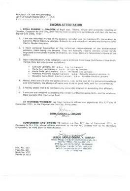 KNOW ALL MEN BY THES PRESENTS: That the late R OLANDO FACTURA LANCERO, who died on July 23, 1998 in Faith Hospital, Ozamiz City, Misamis Occidental, died without any will or testament and without any outstanding debts in favor of any person or entity, that at the time of his death, left a certain real property, A PARCEL OF LAND with TCT No. T-44475, situated in the City of Cagayan de Oro, containing an area of SEVEN HUNDRED SEVENTY TWO (772) SQUARE METERS, more or less. Is the subject of EXTRAJUDICIAL SETTLEMENT OF ESTATE, made and entered into this 22nd day of DECEMBER 2021 by and among: ROLANDO ANTONINO ABUTON LANCERO, of legal age, formerly a Filipino and now a naturalized citizen of the United States of America, and with residence and postal address at 3 Morningside Drive, Old Bridge, NJ 08857, United States of America; MARIA THERESE VERONICA ABUTON LANCEROALEGRES, of legal age, formerly a Filipino and now a naturalized citizen of the United States of America, and with residence and postal address at 223 Elmwood Ave., Union, NJ 07083, United States of America; RONALDO DARIO MARTIN ABUTON LANCERO, of legal age, formerly a Filipino and now a naturalized citizen of the United States of America, and with residence and postal address at 159 Byrd St., Oceanside, NY 11572, United States of America; Registered in the name of LUIS F. LANCERO, JR., married to Corazon Lai Lancero and residents of Long Beach, California, U.S.A.; ROLANDO F. LANCERO, married to Leticia Abuton and resident of Ozamiz City; LUZMIN L. CAAGBAY, married to Pastor CAAGBAY, and resident of Cagayan de Oro City; EPHRAIM F. LANCERO, married to Virginia Estabillo and resident of Tagum, Davao; PRECIOUSA L. ROA, married to Waldo A. Roa and resident of Cagayan de Oro. THAT said deceased co-owned the abovedescribed property together with his siblings, and owned one-fifth (1/5) of it; Filed by the heirs of ROLANDO FACTURA LANCERO. As per Doc. No. 329; Page No. 67; Book No. VIII; Series of 2021 under the Notarial Registry of ATTY. JESUS CARLO JOENIL A. QUIRAP.