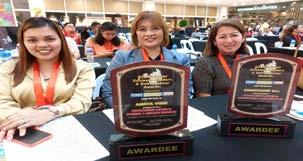 OUTSTANDING BUSINESS AWARDS. ANAKCIANO, Inc., a homegrown agro-industrial company, represented here by (from right) Erlinda Unabia, Vangie Sario and Aisa Zulita, is this year’s recipient of the award in the agriculture and agro-industry category in the 9th Mindanao Business Leaders & Entrepreneurs Awards held November 8 at Ayala Mall Centrio in Cagayan de Oro City. Photos by Gerry L. Gorit.