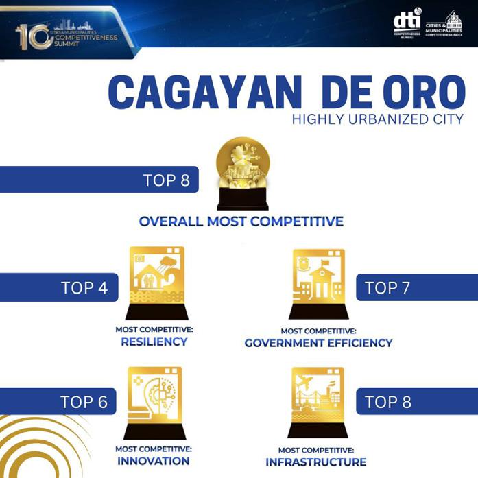 Aside from landing in the 8th spot, Cagayan de Oro City grabbed special awards in four (4) out of five (5) CMCI pillars, namely: Government Efficiency, Economic Dynamism, Infrastructure, Resiliency, and Innovation. This year, LGU-CDO is Top 4 in Resiliency, Top 6 in Innovation, Top 7 in Government Efficiency, and Top 8 in Infrastructure against competing highly urbanized cities in the country.