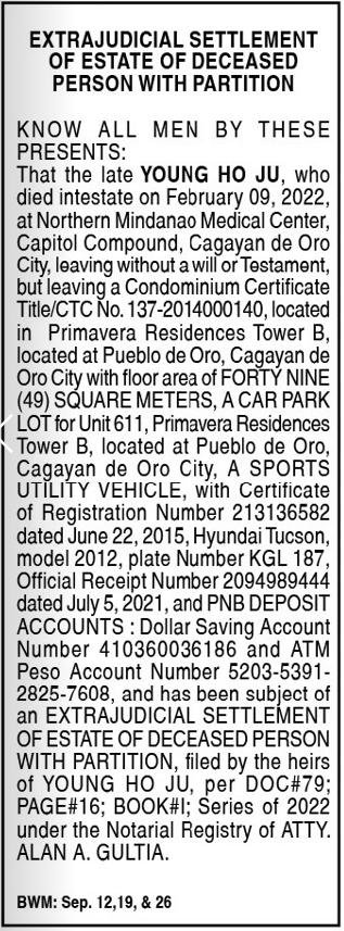 KNOW ALL MEN BY THESE PRESENTS: That the late VICTOR C. COLITA who died on October 18, 2021 at Polymedic Plaza Hospital Cagayan de Oro City, said deceased died intestate, without any Last Will or Testament and without any outstanding debts in favor of any person or entity; the deceased at the time of his death left a savings account in amounting to PHP 291,957.31 at BANCO DE ORO-Osmeña Branch, Cagayan de Oro City, under the Account Name of VICTOR C. COLITA with the Account No. 003110031242, and PHP 36, 935.26 at RCBC- Lapasan Branch, Cagayan de Oro City, under the name of VICTOR C. COLITA with the Account No. 0000001503377558, and has been the subject of an DEED OF EXTRAJUDICIAL SETTLEMENT OF ESTATE OF THE LATE VICTOR C. COLITA, filed by the heirs of VICTOR C. COLITA, per DOC #428; PAGE #86; BOOK #12; Series of 2022 under the Notarial Registry of ATTY. RUFELIZ ANN S. ABBU-DAILO.