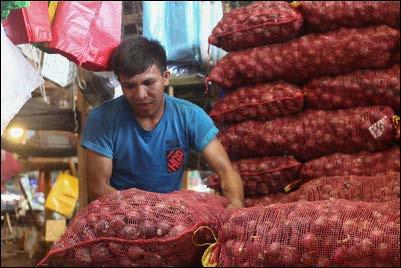 ONION SHORTAGE. A laborer piles bags of Bombay onions at a stall in Bankerohan Market, Davao City on Wednesday, Nov. 16, as the price of this essential cooking ingredient soars to as much as P300 a kilo. MindaNews photo