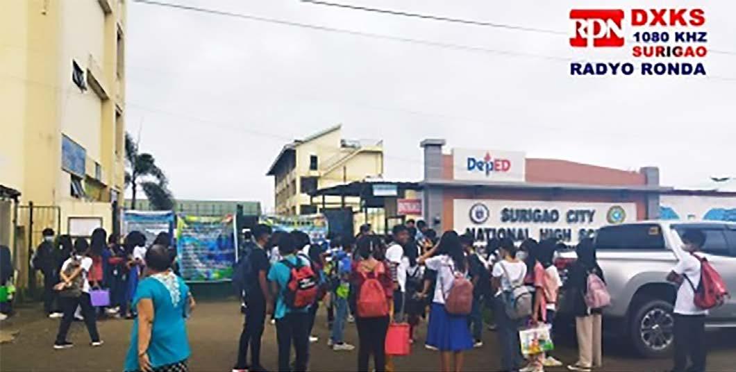 Students of the Surigao City National High School in Surigao City are gathered on safer grounds due to a bomb threat on Wednesday morning (Nov. 16, 2022). No bomb was found by personnel of the Surigao City Police and the Explosive and Ordnance Disposal team after a thorough search of the school premises. (P hoto courtesy o F r P n d X ks s urigao )