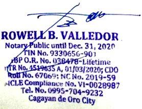 IN WITNESS WHEREOF, we have hereunto affixed our signatures this 07 day of September 2020 at Cagayan de Oro City.