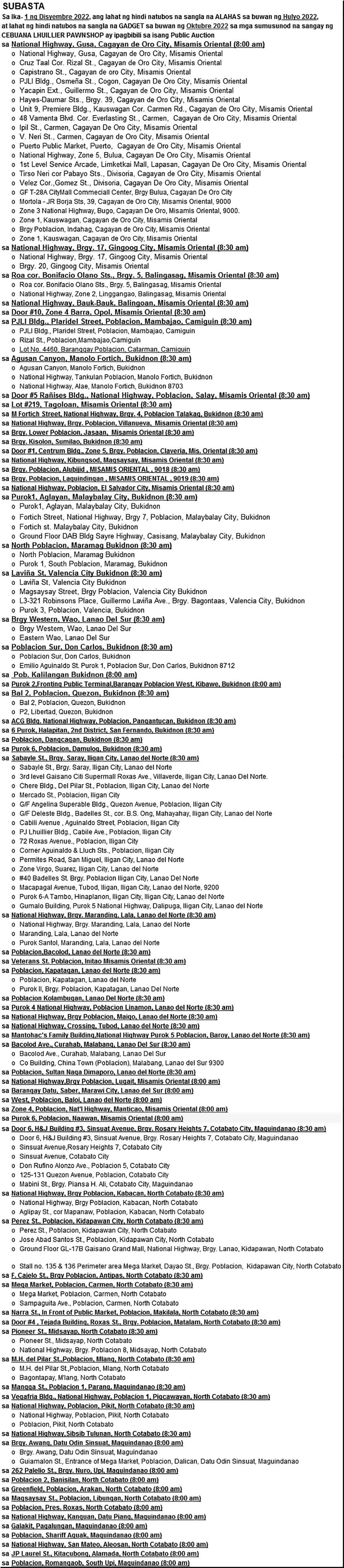 Sa Disyembre 2-3, 2022 sa may 10:00 sa buntag paingon da alas 12 sa udto, ang Tanan nga penirenda nga wala malukat sa bulan sa Hulyo 2022 maapil sa subasta sa Osmeña-Cogon Market ug Ipil St., Carmen, Cagayan de Oro City. Giawhag ang tanan suki sa pagsusi sa ilang resibo.