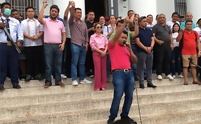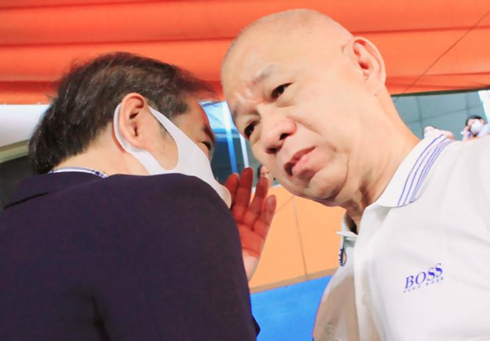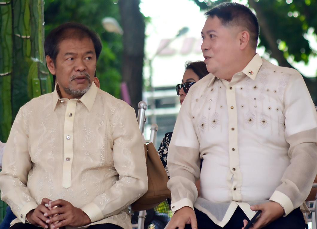 Misamis Oriental Gov. Peter M. Unabia (left) whispers to Cagayan de Oro City Mayor Rolando “Klarex” Uy during Uy’s first 100 days report at the city hall.quadrangle on