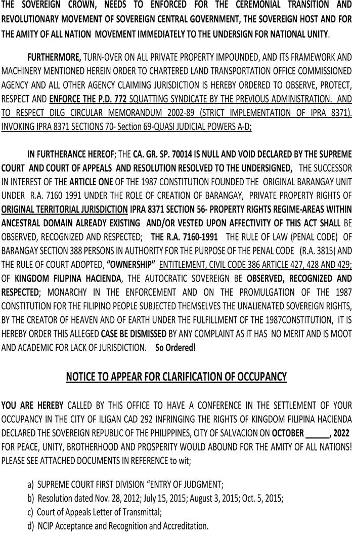 2 FOR ADS PLACEMENT CALL OR TEXT: 0917-712-1424 • 0947-893-5776 mindanaodaily.ads@gmail.com Editor: Allan MedianteThursday, October 13, 2022 Nation Republic of the Philippines SUPREME COURT 4th Shari’a Circuit Court 4th Shari’a Judicial District Iligan City IN RE: JOINT PETITION TO APPROVE CIVIL CASE N0.2022-123 AND REGISTER THE DIVORCE OF SPOUSES ROLDAN W. ENAD AND MARJORIE B. MINGO-ENAD, ROLDAN W. ENAD AND MARJORIE B. MINGO-ENAD, Petitioners. x - - - - - - - - - - - - - - - - - - - - - - - - - - - - / ORDER Before this Court verified joint petition for the approval and registration of the Divorce filed by petitioners and alledging among others. That petitioners are husband and wife respectively in a marriage performed under Civil rite on April 18, 2007 at Iligan City, both petitioner’s had been converted to Muslim and thereby embraced Islam Religion as their new found faith, by virtue of their respective intellectual choices which were duly registered with this Court, both of them can be served summons and other legal processes relative to this case at their resident at 10th East Rosario Heights, Tubod, Iligan City and Luinab, Iligan City respectively; That said marriage did not last long due to lack of love and affection until the relationship manifested incompatibility and sustained misunderstanding between petitioners and reached the point of irreconcilability and they separated for each other for some reason of which both petitioner finally decided to legally break or severe their marriage bond for five (5) years and they decided to separate live physically in bed and board, thereby, executed Memorandum of Agreement in order to formalize their separation. Since their separation, they had never been communicating or supporting either financially or emotionally to each other, neither mind ing each other affair’s; petitioner seek judicial decree of divorce, thereby, severing their marriage bond on April 18, 2007 so that they will have free hand to do what a single man or woman could do without marital burdens. Reconciliation between them had already been diligently employed but all proved futile. WHEREFORE, finding this petition to be sufficient in form and substance, set the initial hearing of this case on November 18, 2022 at 9:00 a.m. at which time, date and place. Any interested party may appear and show why the petition should not be granted. Let copy of this Order be published in newspaper of General Circulation in the City of Iligan once a week for three (3) consecutive weeks at the expense of the petitioners. SO ORDERED. Iligan City, Philippines, this 11th day of October, 2022. HON. OSOP M. ALI Presiding Judge MDN: Oct 13, 20 & 27, 2022 Republic of the Philippines SUPREME COURT 4th Shari’a Circuit Court 4th Shari’a Judicial District Iligan City IN RE: JOINT PETITION TO APPROVE CIVIL CASE NO.2022-117 AND REGISTER THE DIVORCE BETWEEN FREDERIC ROY P. GUINITARAN AND MARICHEL M. HONTIVEROS-GUINITARAN, FREDERIC ROY P. GUINITARAN AND MARICHEL M. HONTIVEROS-GUINITARAN, Petitioners. x - - - - - - - - - - - - - - - - - - - - - - - - - - - - / ORDER Before this Court verified joint petition for the approval and registration of the Divorce filed by petitioners and alledging among others. That petitioners are husband and wife respectively in a marriage performed under Civil rite on January 11, 2003 at Mambajao, Camiguin, both petitioner’s had been converted to Muslim and thereby embraced Islam Religion as their new found faith, by virtue of their respective intellectual choices which were duly registered with this Court, both of them can be served summons and other legal processes relative to this case at their resident at Lacas, Mambajao, Camiguin and Esperanza, Bacolod, Lanao del Norte respectively; That said marriage did not last long due to lack of love and affection until the relationship manifested incompatibility and sustained misunderstanding between petitioners and reached the point of irreconcilability and they separated for each other for some reason of which both petitioner finally decided to legally break or severe their marriage bond and they decided to separate live physically in bed and board, thereby, executed Memorandum of Agreement in order to formalize their separation. Since their separation, they had never been communicating or supporting either financially or emotionally to each other, neither minding each other affair’s; petitioner seek judicial decree of divorce, thereby, severing their marriage bond on January 11, 2003 so that they will have free hand to do what a single man or woman could do without marital burdens. Reconciliation between them had already been diligently employed but all proved futile. WHEREFORE, finding this petition to be sufficient in form and substance, set the initial hearing of this case on October 24, 2022 at 9:00 a.m. at which time, date and place. Any interested party may appear and show why the petition should not be granted. Let copy of this Order be published in newspaper of General Circulation in the City of Iligan once a week for three (3) consecutive weeks at the expense of the petitioners. SO ORDERED. Iligan City, Philippines, this 26th day of September, 2022. HON. OSOP M. ALI Presiding Judge MDN: Sept 29, Oct 6 & 13, 2022 Republic of the Philippines SUPREME COURT 4th Shari’a Circuit Court 4th Shari’a Judicial District Iligan City IN THE MATTER OF JOINT PETITION TO CIVIL CASE N0. 2022-120 APPROVE AND REGISTER THE DIVORCE BETWEEN SPOUSES HERNANDO M. RAFOL AND TERESITA A. FERNANDEZ, HERNANDO M. RAFOL AND TERESITA A. FERNANDEZ, Petitioners. x - - - - - - - - - - - - - - - - - - - - - - - - - - - - / ORDER Before this Court verified joint petition for the approval and registration of the Divorce filed by petitioners and alledging among others. That petitioners are husband and wife respectively in a marriage performed under Civil rite on February 16, 1998 at Cagayan de Oro City, Misamis Oriental, both petitioner