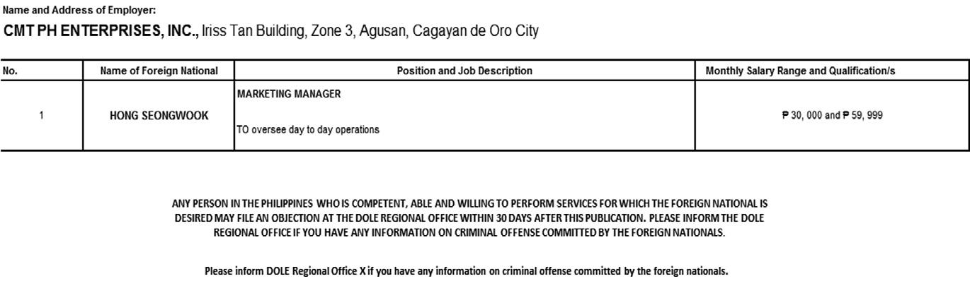 Republic of the Philippines DEPARTMENT OF LABOR AND EMPLOYMENT Regional Office No. 10 5F and 6F Trinidad Building, Corner Capistrano-Yacapin Streets, Cagayan de Oro City
