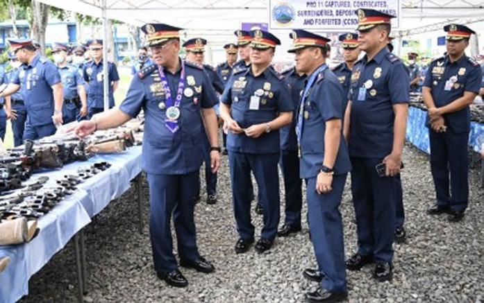 MAJOR FEAT. Philippine National Police chief Gen. Rodolfo Azurin Jr. (left) inspects seized illegal firearms during his visit to the Police Regional Office 11 in Davao City on Nov. 17, 2022. He praised the leadership of Brig. Gen. Benjamin Silo Jr. for the anti-criminality efforts that resulted in the recognition of drug-cleared municipalities and the declaration of Davao Region as insurgency-free. ( c ou R tesy of pnp f acebook )