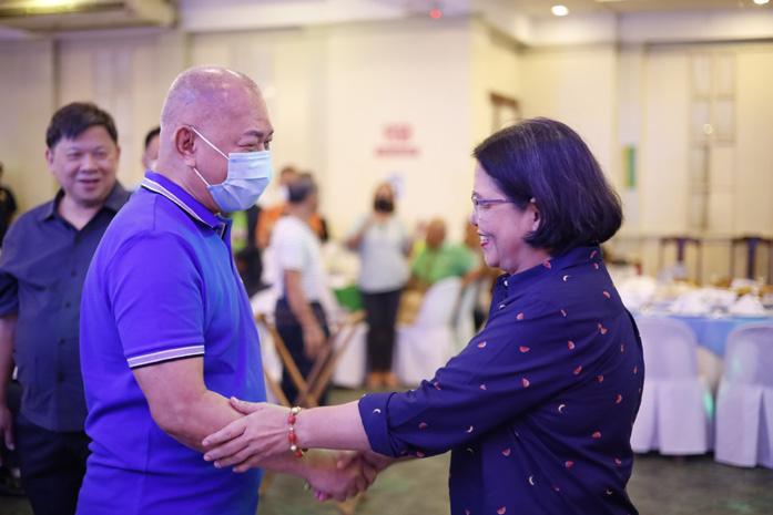 CAGAYAN de Oro City Mayor Rolando "Klarex" Uy exchanges pleasantries with Barangay 21 Punong Barangay Gilda "Gigi" Go during the recent Christmas party of the Association of Barangay Councils. PB Go expresses her appreciation on Mayor Uy's assurance that the City's Chief Executive will give barangay chairmen a free hand on their respective projects. At left is ABC sectoral representative Yan Lam "Alam" Lim. CITY MAYOR'S OFFICE PHOTO
