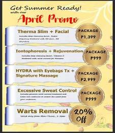 Get Summer Ready with our April Promo only here at Rajeunir Facial and Body Spa Therma Slim + Facial for 1,399php Iontophoresis + Rejuvenation for 999php Hydra with eyebags Tx + Signature Massage for 2,999php Excessive sweat control for 999php Warts Removal 20percent off (1-5pm)