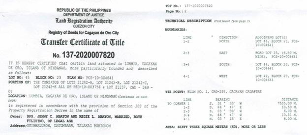 1 A PARCEL OF LAND (Lot 6, Block 6, Psd-10-037341, being a portion of Pcs-10-000251), situated in the Barrio of Lumbia, City of Cagayan de Oro, Island of Mindanao, containing an area of ONE HUNDRED TWENTY (120) SQUARE METERS, more or less and embraced in TCT No. T-160488.