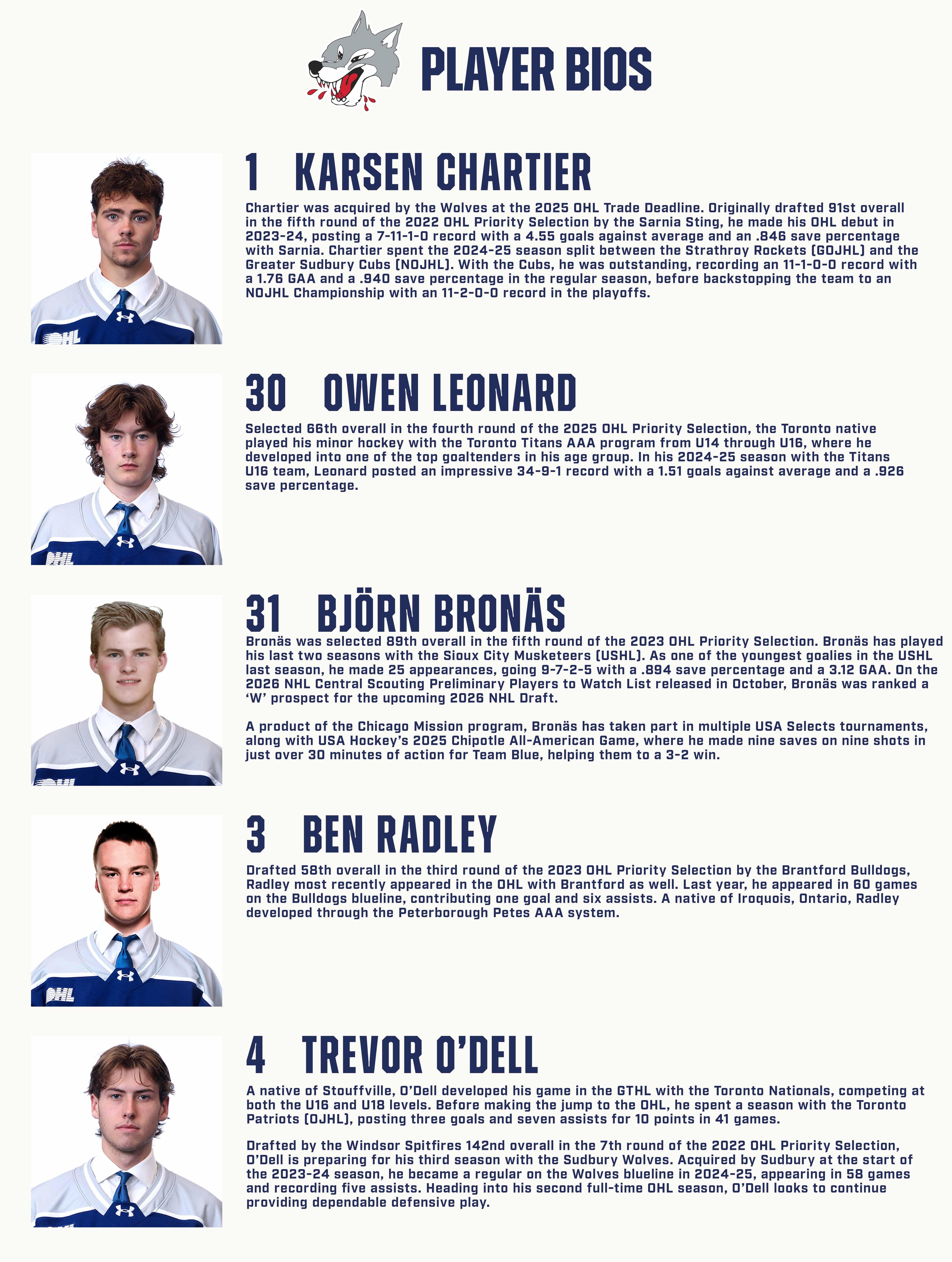 The London, ON native Ethan Dean is now in his sophomore season with the Sudbury Wolves. Selected by the Wolves in the second round of the 2024 OHL Priority Selection, Dean made his debut last season, showcasing strong defensive instincts and serving as a key part of the penalty kill. Through 55 games, he tallied five assists and two goals, both of which were shorthanded markers. This season, Dean has recorded two assists through his first 21 games while continuing to be a strong defensive presence and a mainstay on the Wolves’ penalty kill. Down the stretch, Dean looks to increase his production and turn himself into a true two-way forward to catch the attention of scouts across the NHL.