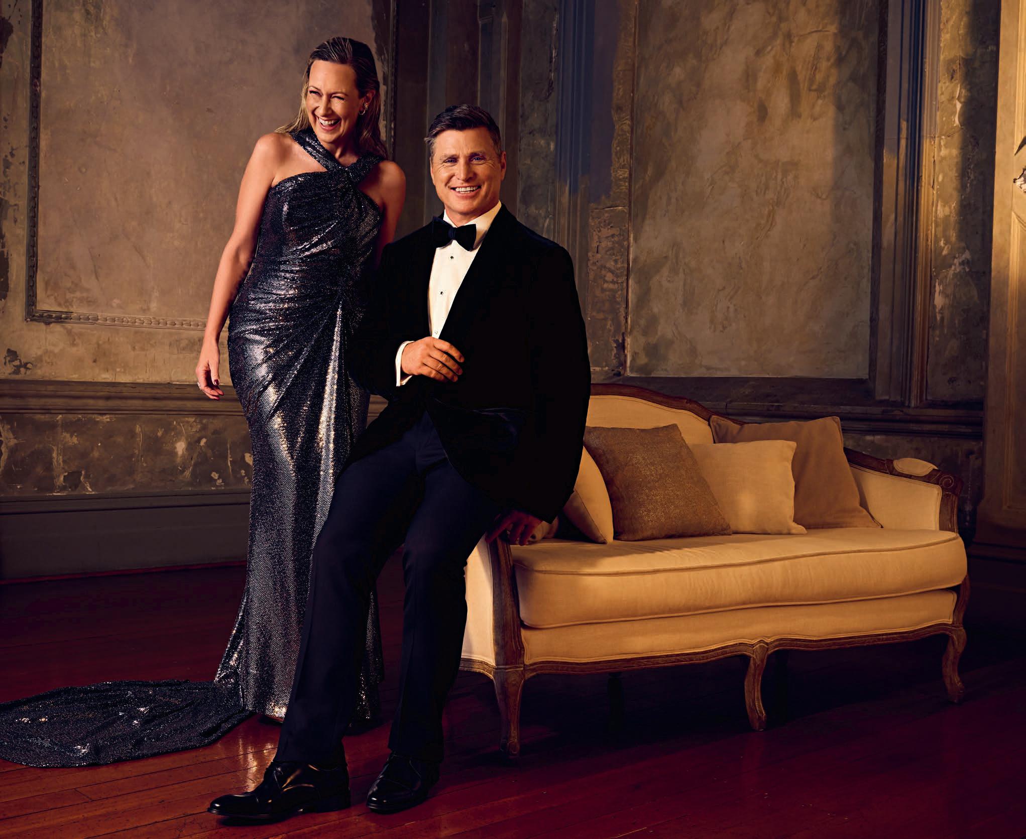 Sarah Maree Cameron wears Nicole Bakti dress from Duchess Boutique, Anton Jewellery earrings and rings, own bracelet; Gerald Quigley wears Hugo Boss suit and shirt, own glasses; Mel wears Christopher John Rogers dress from Fashion Alta Moda, Anton Jewellery earrings, Tony Bianco heels; Shane Crawford wears Hugo Boss suit, shirt and bow tie