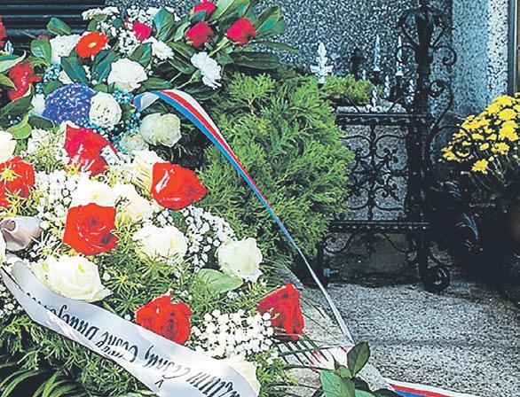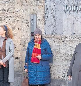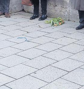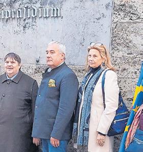 Legten Blumen vor dem Münchner Polizeipräsidium nieder, wo Fritz Gerlich bis zu seiner Ermordung in Dachau inhaftiert war (von links): Prinz Erich von Lobkowicz, Dr. Johannes Modesto, Prinzessin Ludmilla von Lobkowicz, Grä n Stephanie von Waldburg-Zeil, Volksgruppensprecher Bernd Posselt, MdL Ludwig Spaenle, Freifrau Walburga von Lerchenfeld, Anastasia Dick, Michael Dibowski und Sadija Klepo. Foto: Johannes Kijas