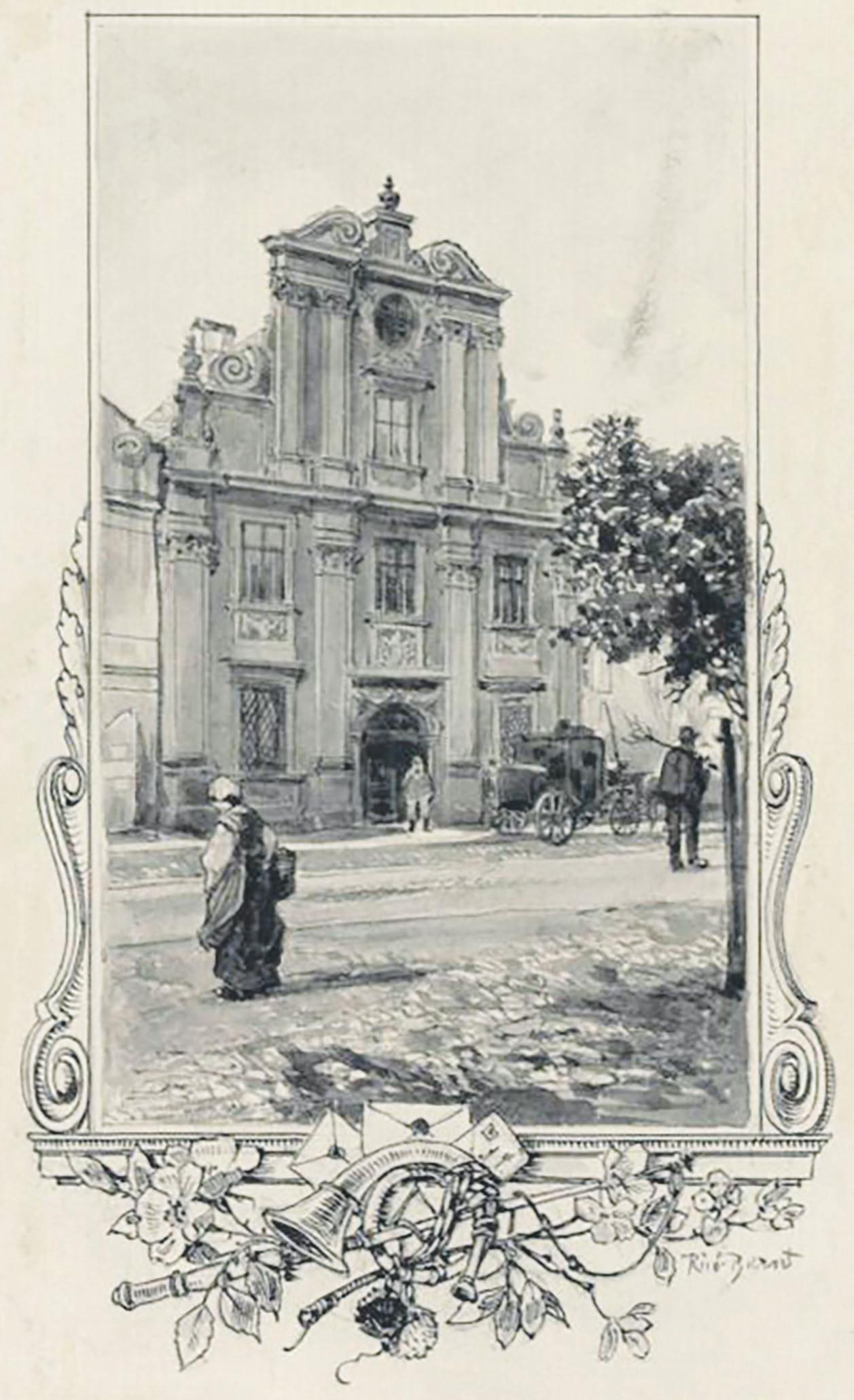 Das Postgebäude in Zuckmantel (Zlaté Hory). Aquarell in Grau und Federzeichnung in Schwarz (Rahmung) von Rudolf Bernt, signiert. Vorzeichnung zum „Kronprinzenwerk“ (Die österreichisch-ungarische Monarchie in Wort und Bild, Wien 1886–1902), Band „Mähren und Schlesien“, 1897, Seite 639.